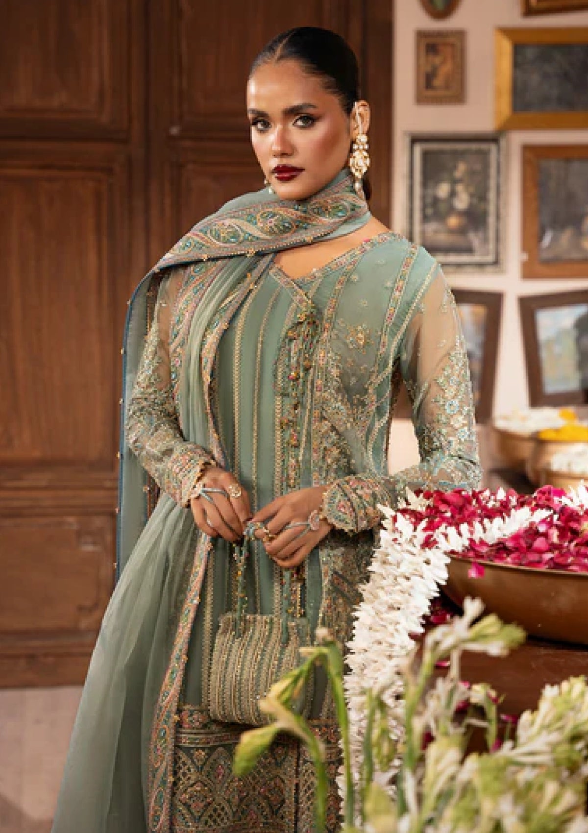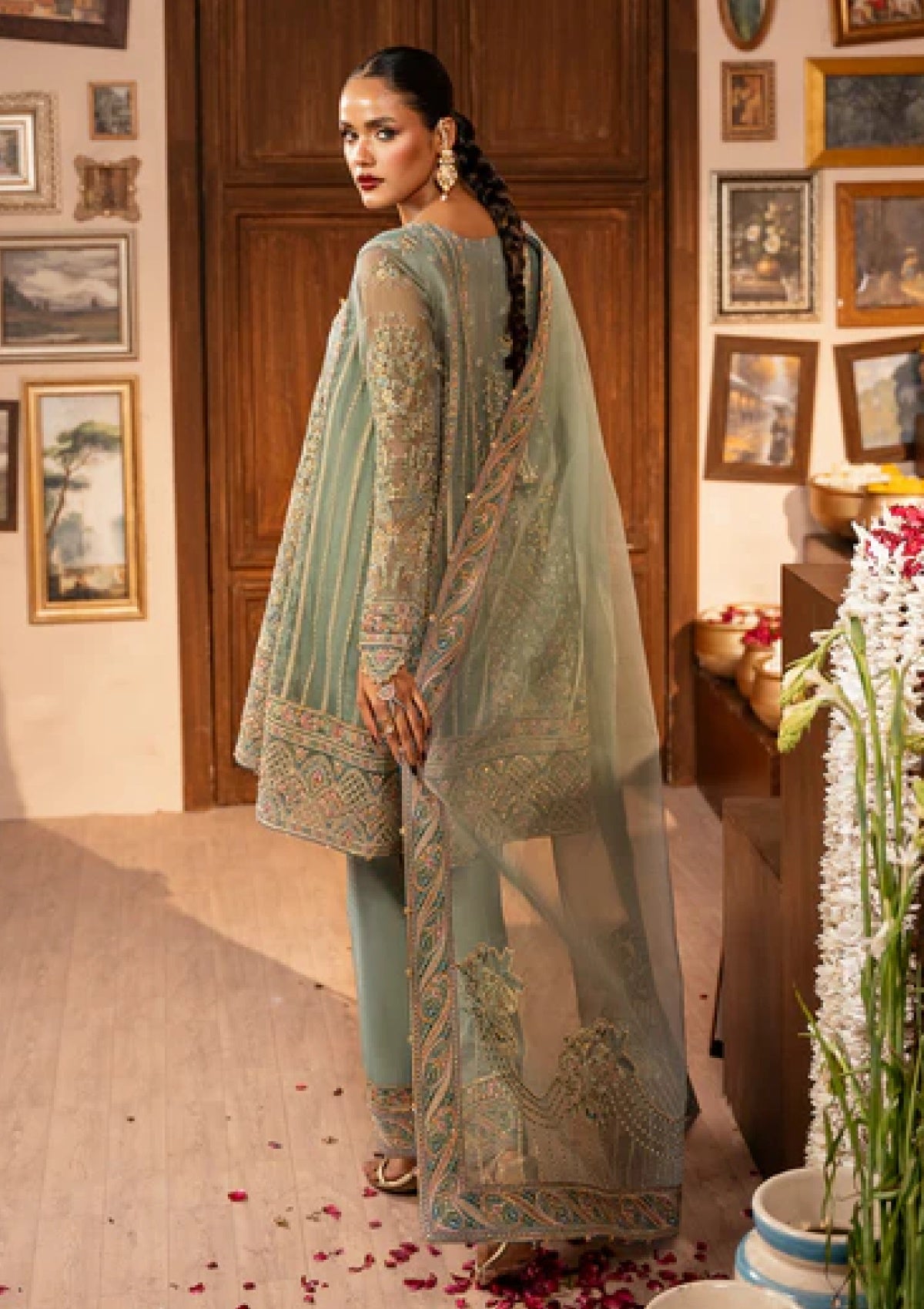 KIRSI, a cyan angrakha brought to life with intricate embroidery on organza panels and sleeves, paired with embroidered raw silk trousers and a organza dupatta — finished with embroidered hand extensions for a regal touch.