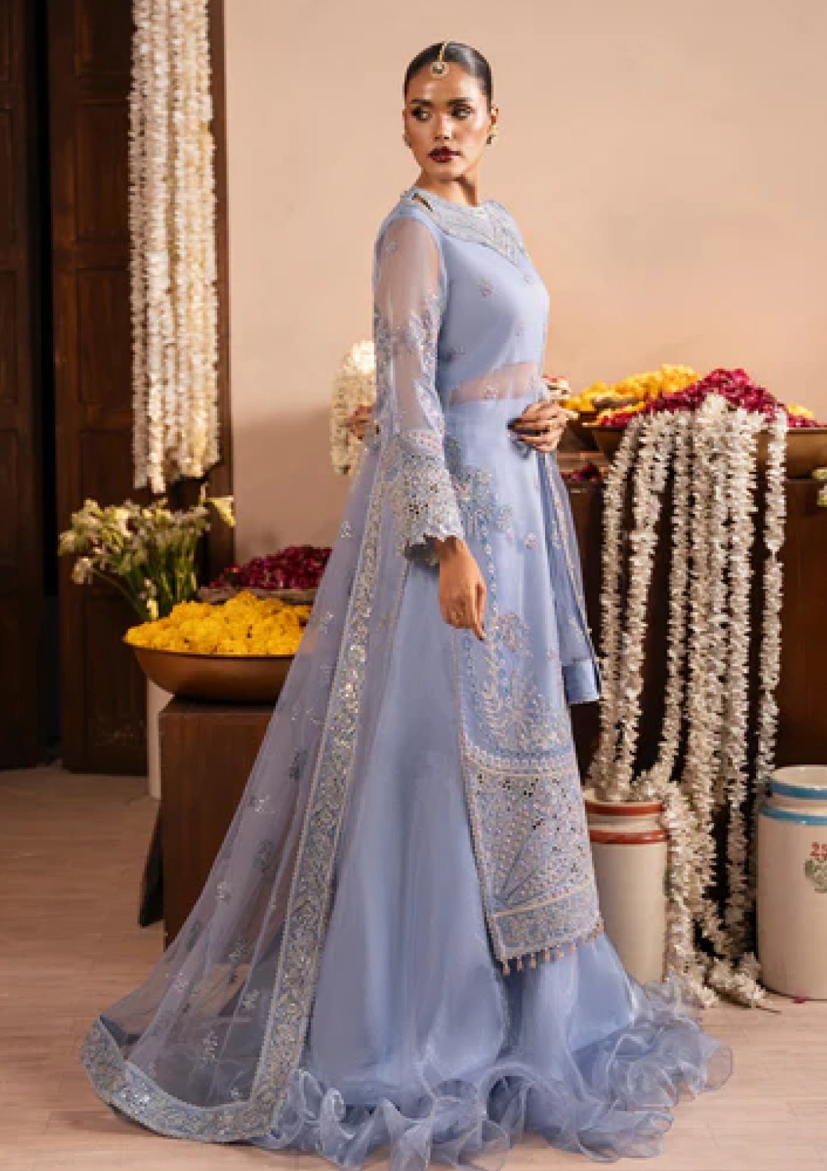 Meet ROOHI, a wedding festive dream in Blue Berry, where delicate organza embroidery meets effortless grace. The embroidered organza shirt and statement neckline are paired with fluid tissue trousers, finished with a finely embroidered net dupatta. Designed for moments that feel magical and memories that last forever.