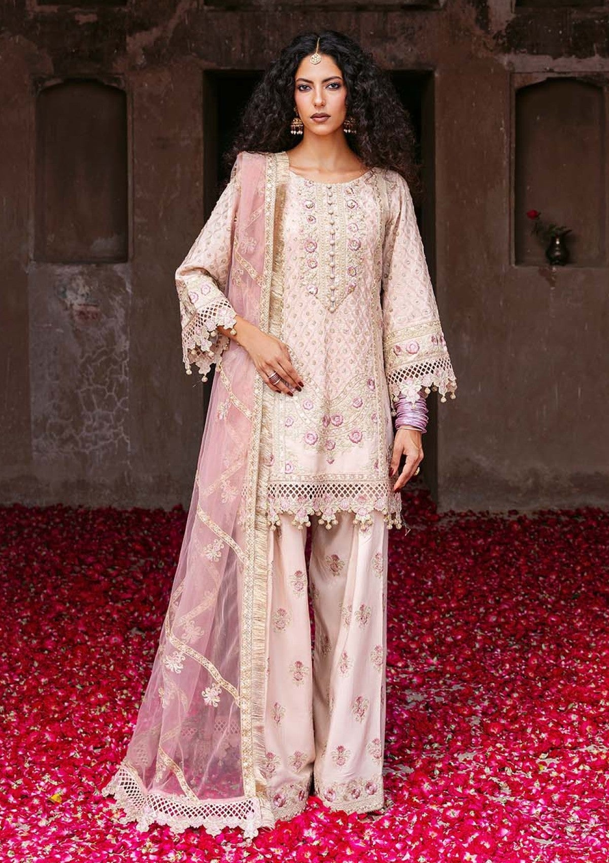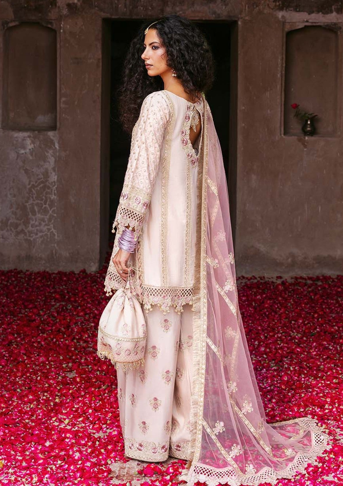 Awash in the tender hues of nude peach and blush pink, Bahār blossoms with the quiet poetry of spring. The raw silk kurta shimmers with sequins embroidery and a hand-embellished neckline, while intricate cutwork borders trace the daman and sleeves with artisanal delicacy. A blush pink net dupatta edged with cutwork embroidery adds a touch of romantic contrast, flowing effortlessly over sequined raw silk farshi shalwar. Bahār embodies grace reborn — a soft symphony of light, craftsmanship, and renewal.