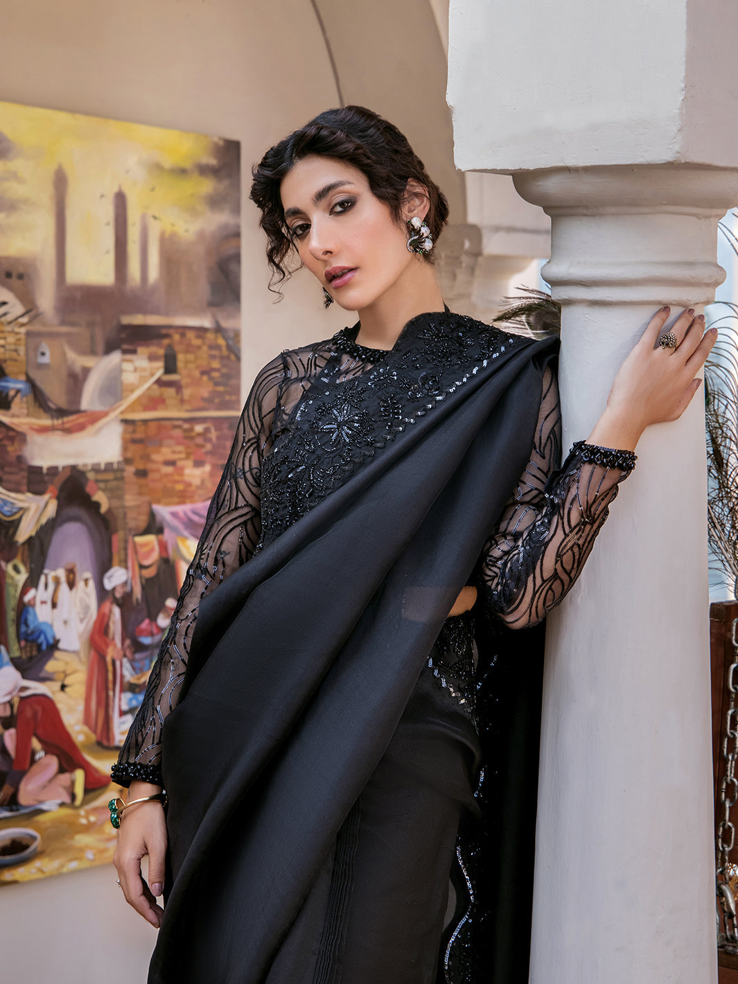 Make a statement in this pure organza saree rendered in jet black. The intricately detailed scalloped borders are hand embellished with beads, crystals and sequin. This enchanting look is perfectly draped along the body, giving a striking silhouette that lets its ravishing hand-embellished details shine. The blouse crafted on a scintillating sequin organza base, features an embellished neckline paired with a halter neckline slip, making it a one-of-a-kind ensemble that is the epitome of elegance and grace.