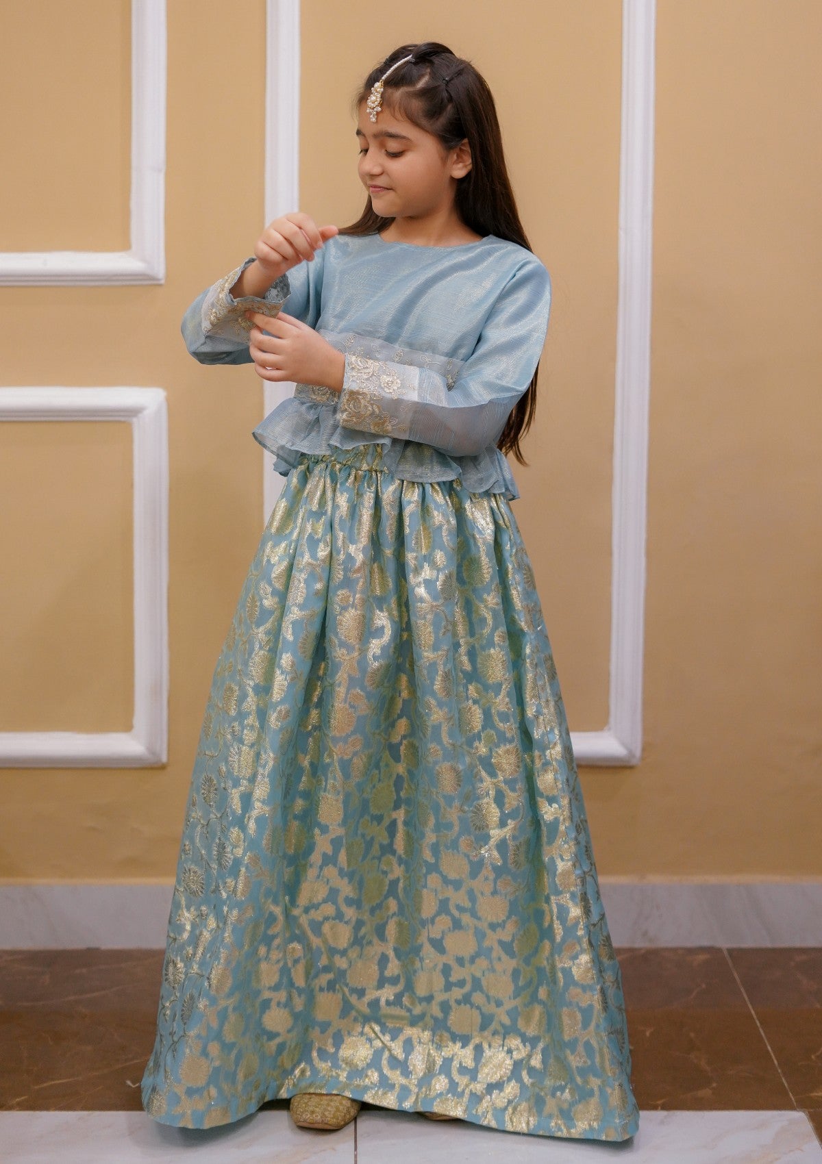 This exquisite outfit features a delicate moonlight organza shirt, shimmering with ethereal translucence. Paired with a silver grey tissue organza lehenga adorned with golden touches and intricate lace details, it exudes timeless grace and festive allure, perfect for special festive occasions.