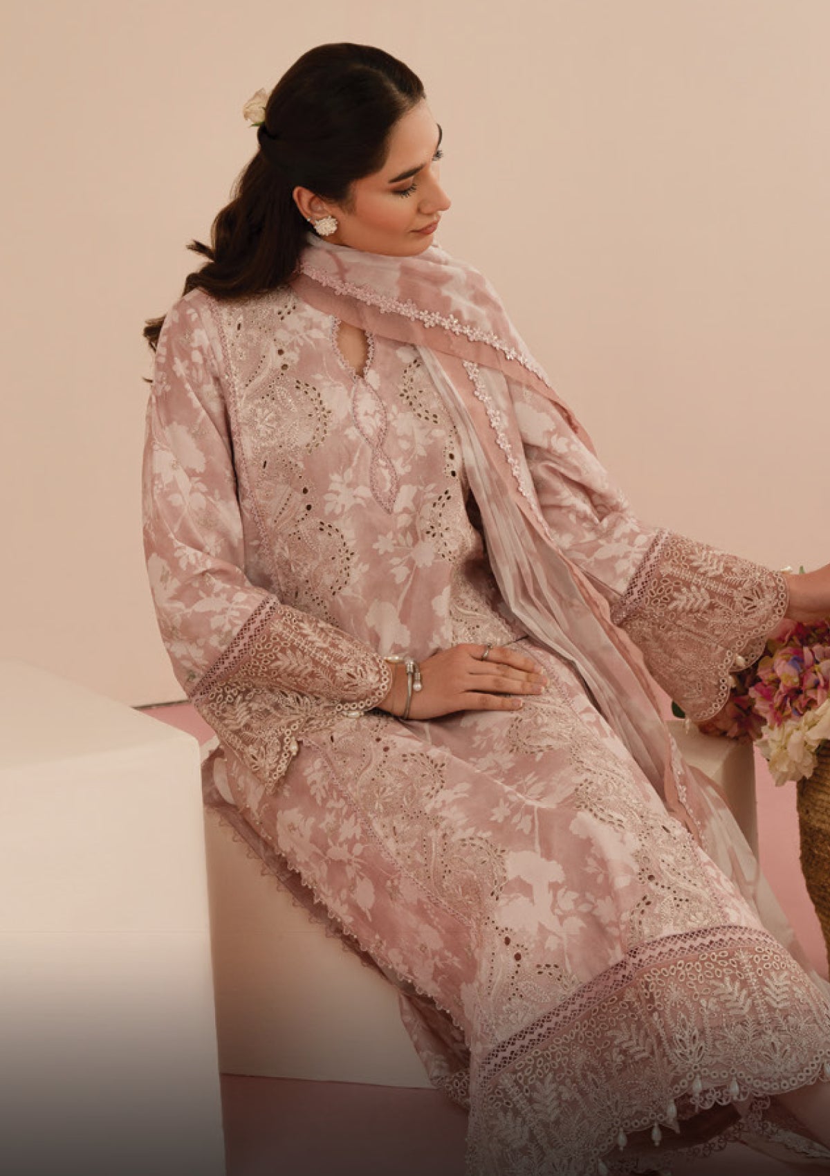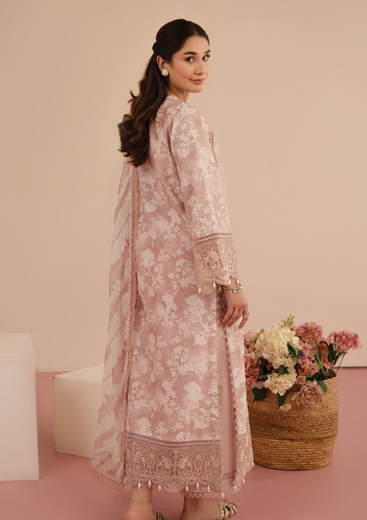 Make a statement in this graceful pink printed long shirt, featuring an embroidered middle panel and intricate sleeve and daman details. Organza patches add texture and luxury, while the plain trouser and digitally printed chiffon dupatta complete the look. Perfect for both casual and festive occasions.