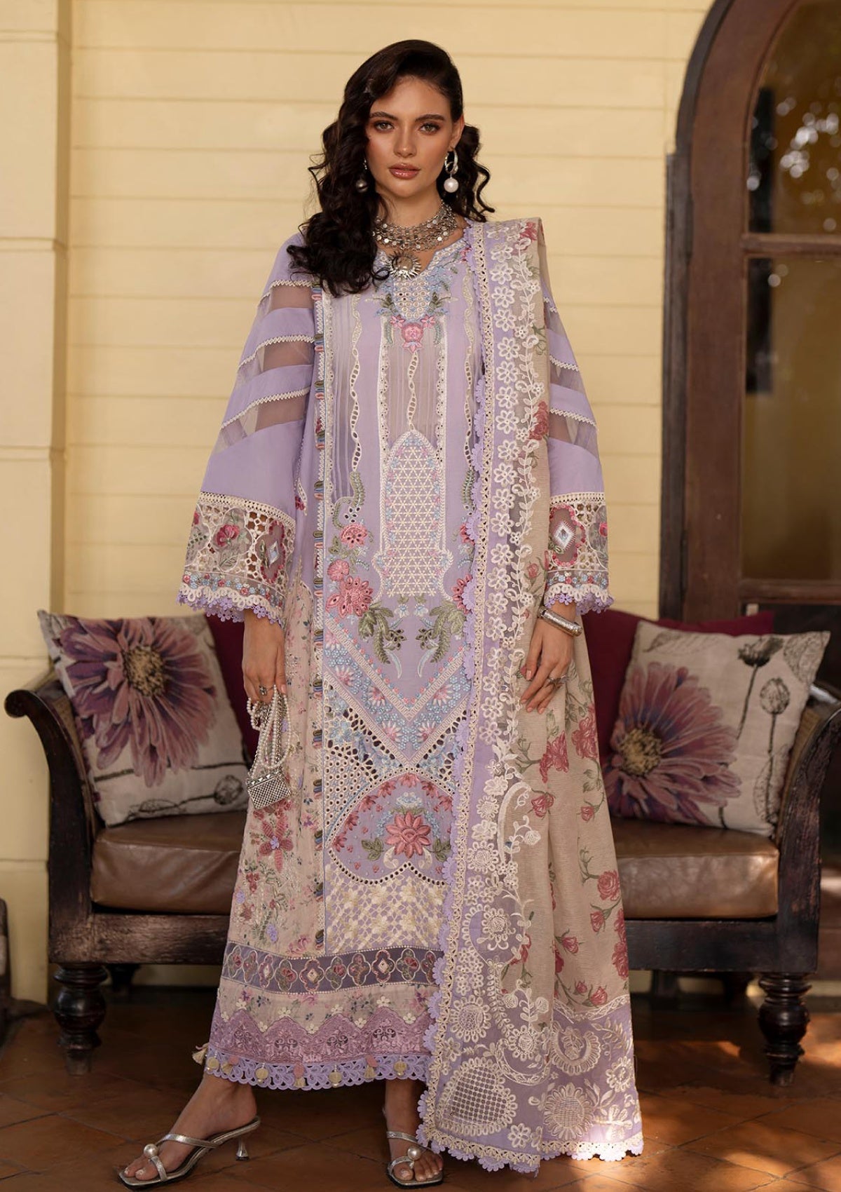 A beautifully composed chikankari embroidered lawn shirt featuring intricate floral motifs, refined panel detailing, and elegant organza borders for a graceful finish. The dupatta, with soft floral hues framed with delicate resham embroidered borders and pallus, adds depth and refined charm. Paired with dyed cambric trousers, this ensemble reflects timeless sophistication and effortless elegance.