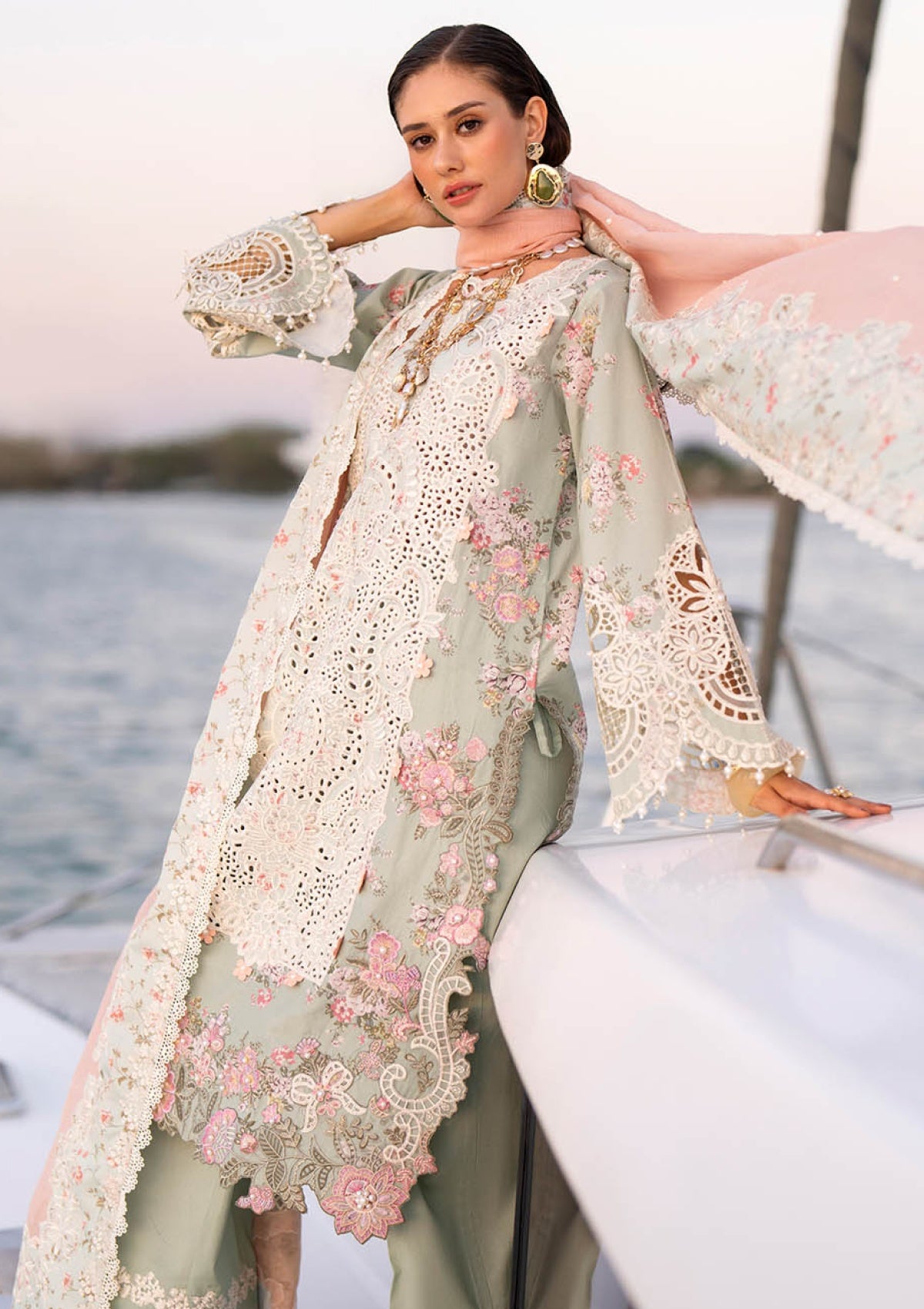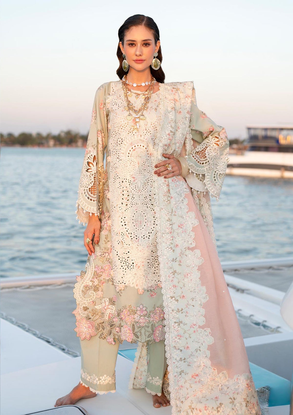 An elegant embroidered lawn outfit featuring laser-cut centre panels and delicate organza motifs on the shirt and sleeves. Paired with a pearl-embellished cotton karandi dupatta and cambric trousers with refined organza borders, this ensemble exudes timeless sophistication.