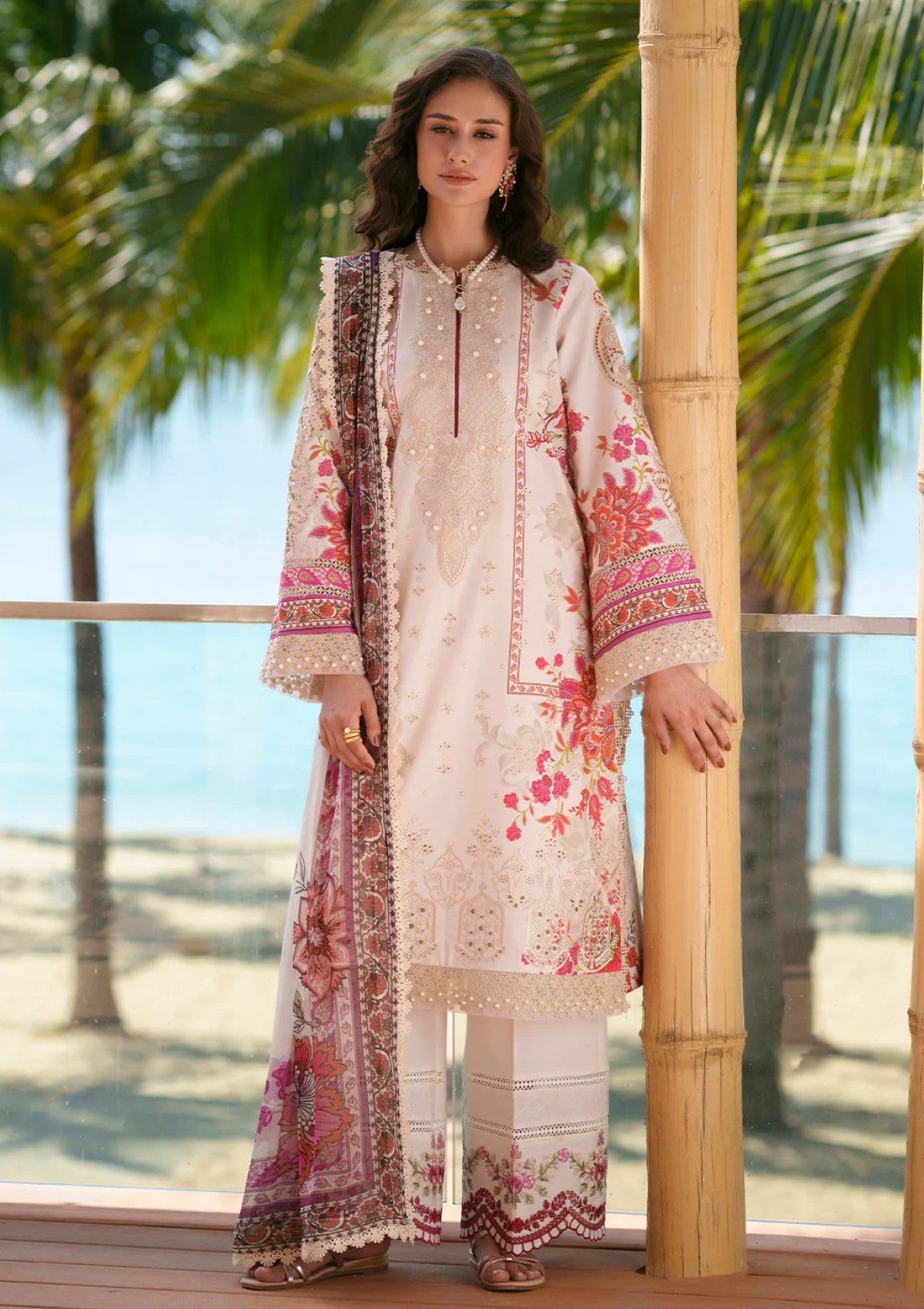 AIRA features a printed lawn shirt beautifully adorned with intricate Chikankari embroidery on the front, highlighted by an elegant embroidered neckline. Embroidered sleeve motifs and trouser borders add delicate sophistication, while printed lawn sleeves and back maintain a cohesive charm. Paired with dyed cotton trousers and a soft chiffon printed dupatta, this ensemble exudes timeless grace and refined elegance.