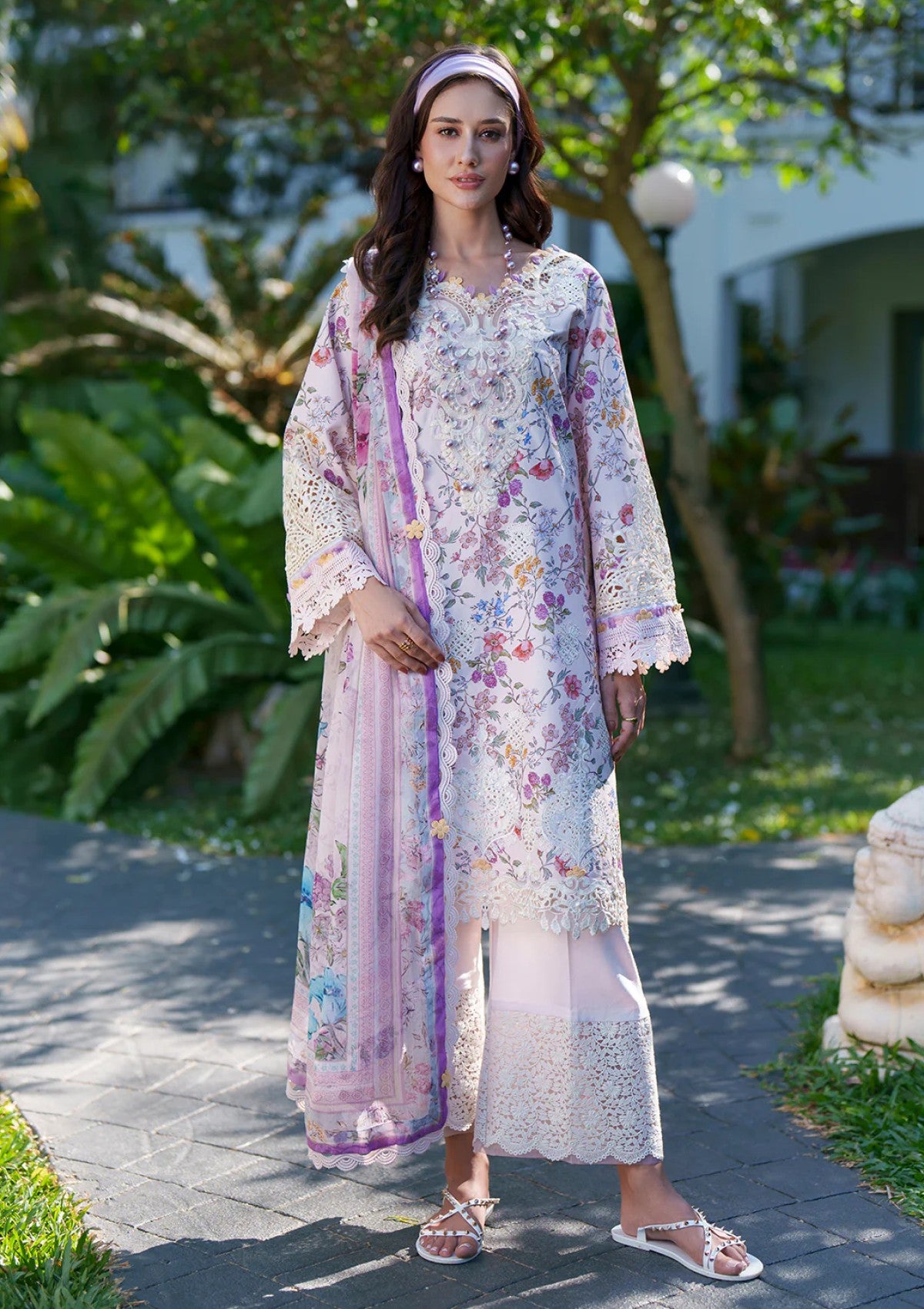 ZURI is a stunning ensemble featuring a printed lawn front adorned with delicate Chikankari embroidery and an intricately embroidered neckline. The embroidered shirt front and sleeve borders add elegant detail, while printed lawn sleeves and back create a harmonious design. Paired with dyed cotton trousers and a soft chiffon printed dupatta, this outfit exudes timeless charm and sophistication.