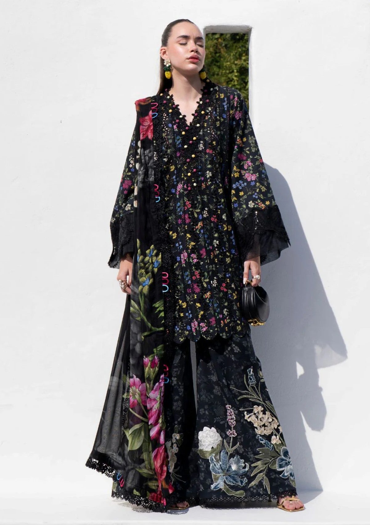 Unveiling the drama you've been waiting for – Midnight Flora! 🖤 Prepare to be utterly captivated by this dramatic ensemble. A drop-dead gorgeous black base becomes the canvas for a breathtaking flora and fauna composition bursting with color – the perfect statement for your summer wardrobe. The front is exquisitely embroidered with schiflee vertical petal lines, shimmering with black sequins that catch the light. Sleeves are thoughtfully finished with black-on-black resham embroidery and even more sequin details on the borders, adding layers of texture and depth. And those trousers? Forget ordinary! We've elevated summer style with these iconic statement trousers – a black and grey printed base brought to life with bold floral motifs dancing along the edges. Midnight Flora isn't just an outfit; it's an experience.