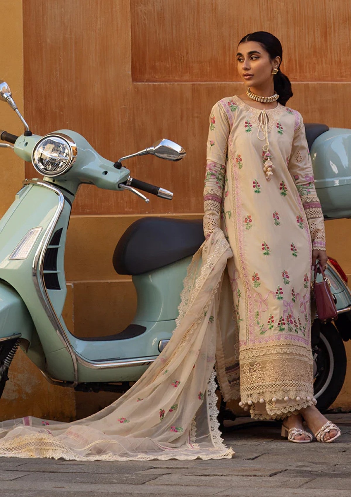 Rosalie, with its buttercream palette, exudes soft elegance through a variety of detailed embroidery stitches, including satin stitch and French knots, creating delicate floral motifs. Intricately embroidered organza borders enhance the sleeves, daman, and neckline, adding a touch of refinement.