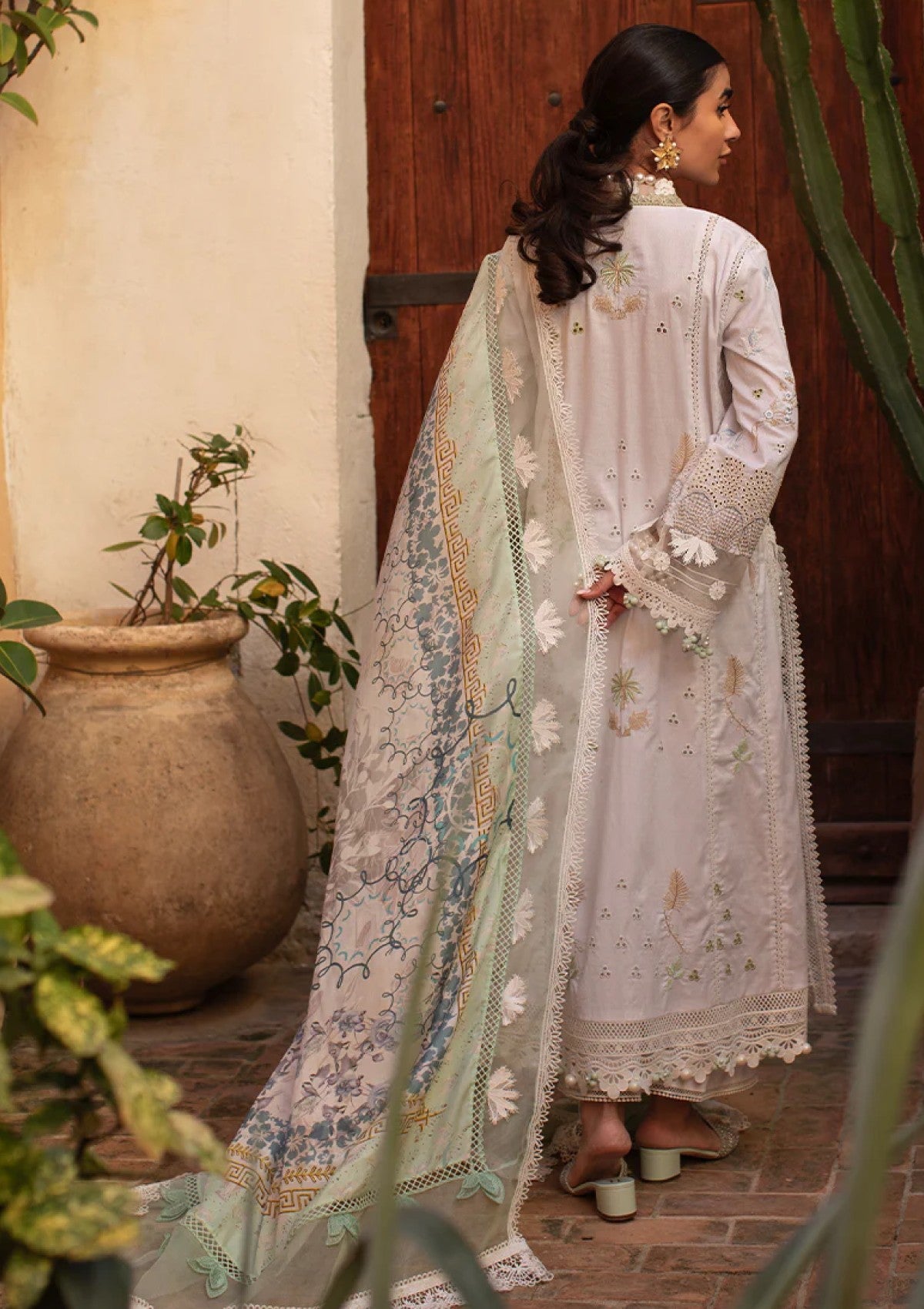 This design features a white base with beachy tones of beige, blue, and green. Embroidered palm trees, seashells, and leaves, along with cutwork organza borders and a printed silk dupatta, create a light, calming coastal aesthetic.