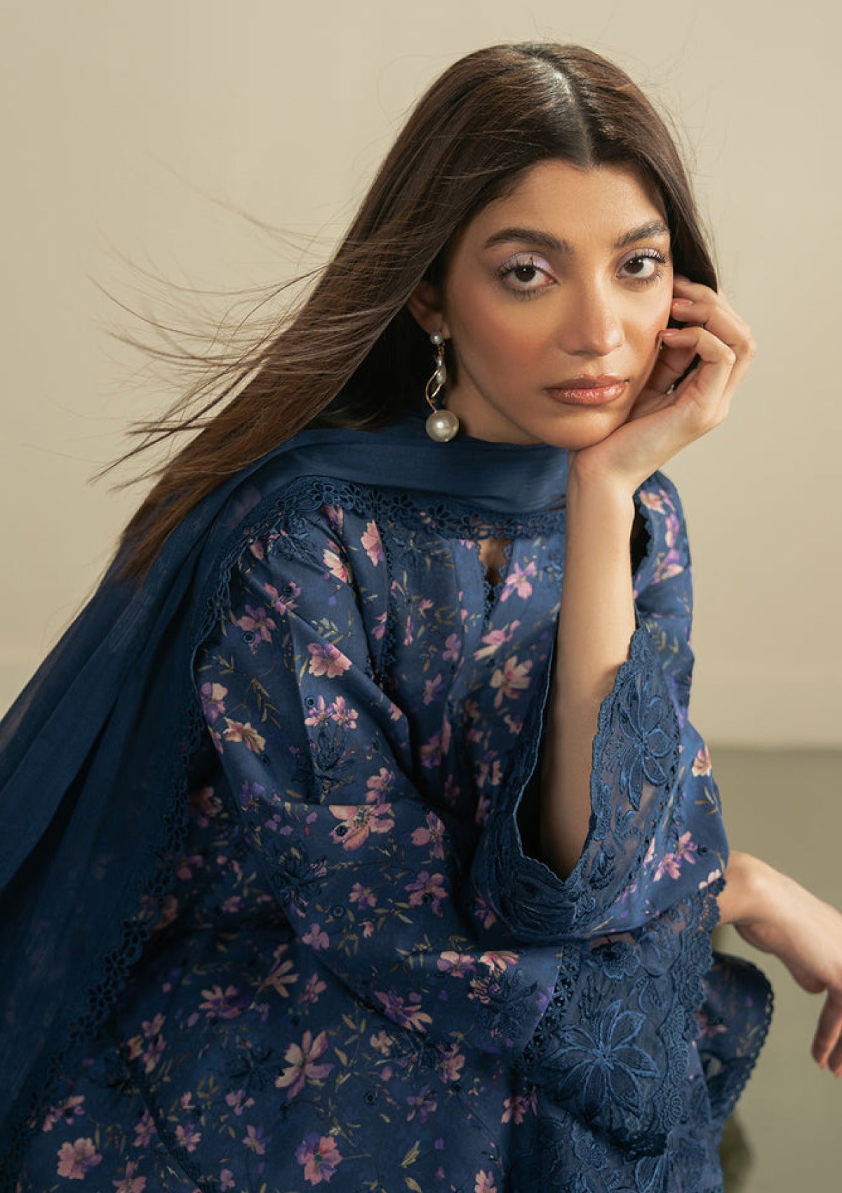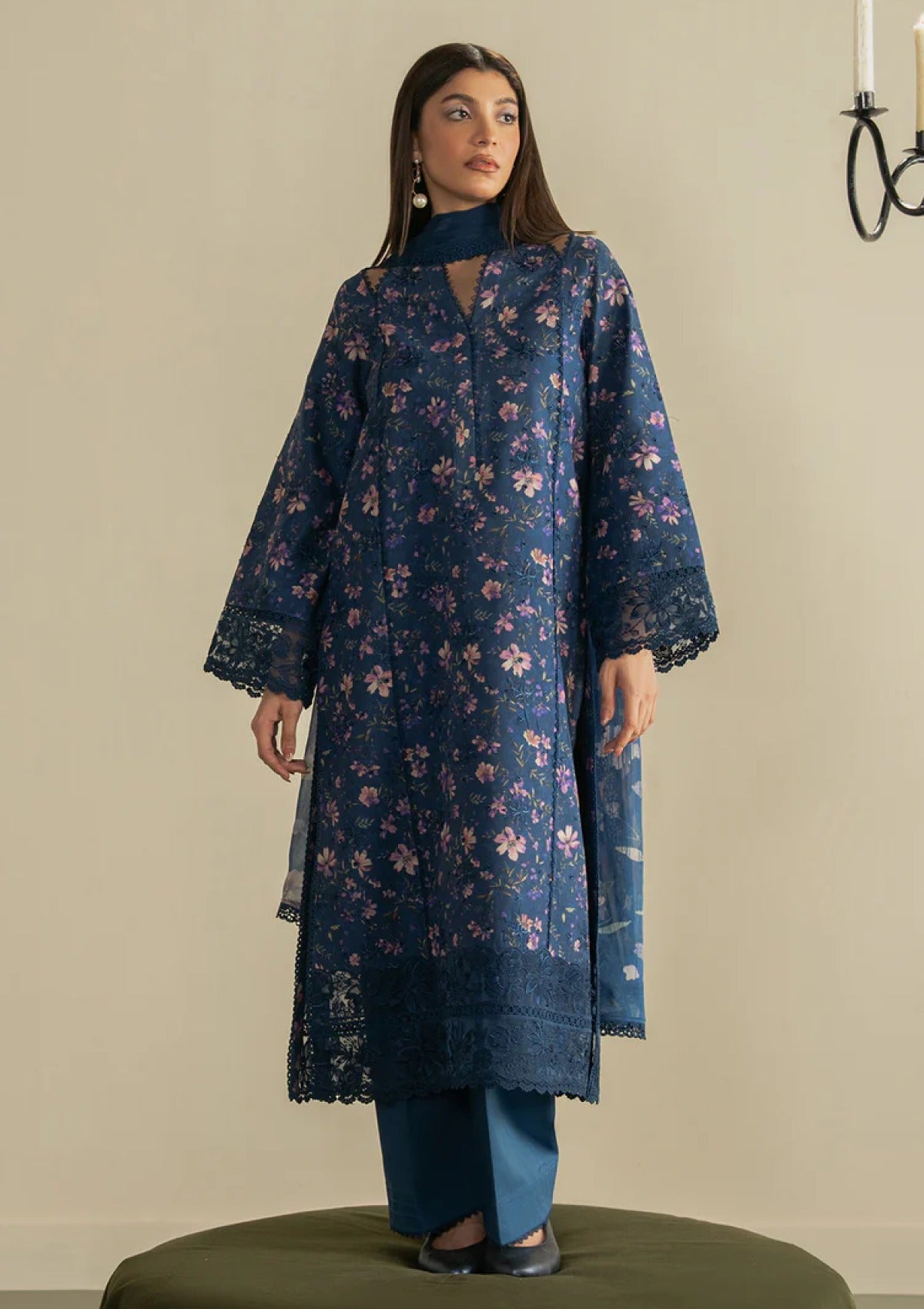 Stepped into serene elegance with dreamy ensemble. Delicately embroidered and digitally printed on airy lawn, this look radiates soft sophustication. Organza borders add a touch of luxe, while the chiffon dupatta flows with effortless grace. Paired with lilac cotton trouser it's the perfect blend of charm and comfort on summer days.