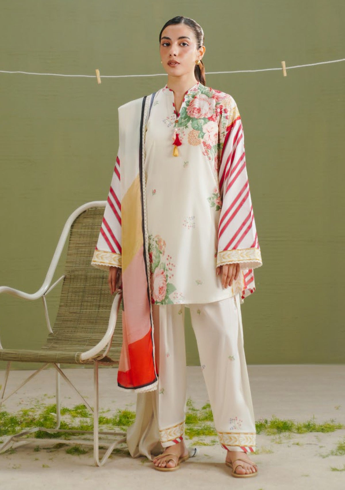 The dupatta features an all-over floral print on an off-white base. The shirt is designed with carrot red stripes layered with floral motifs on off-white. The trouser carry a coordinating floral print on off-white to complete the look