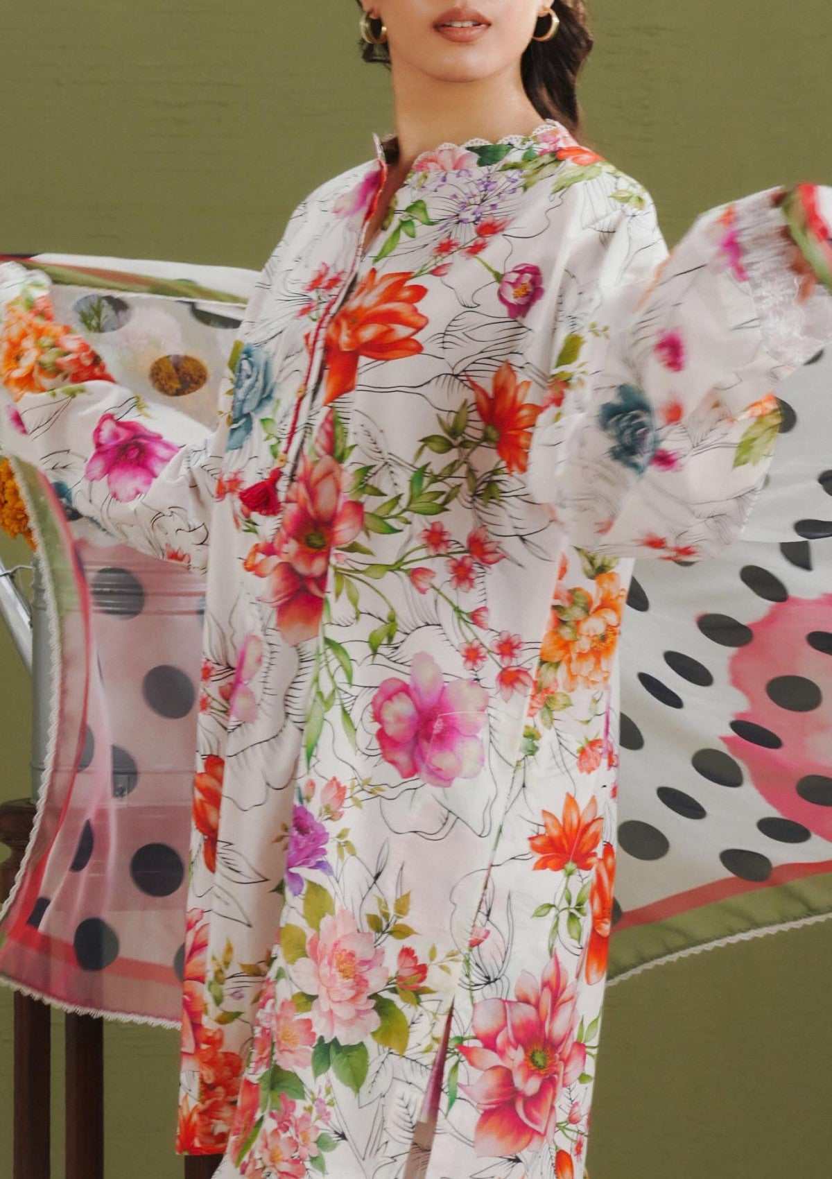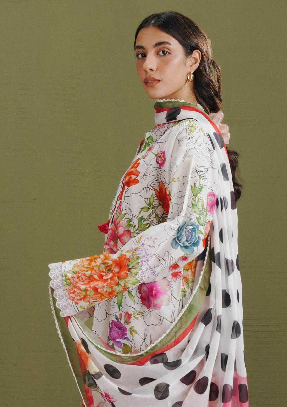 The dupatta is inspired by floral and polka dot elements. The shirt is printed in black and white with colorful floral accents. The trouser feature black and white floral prints to complete the set.