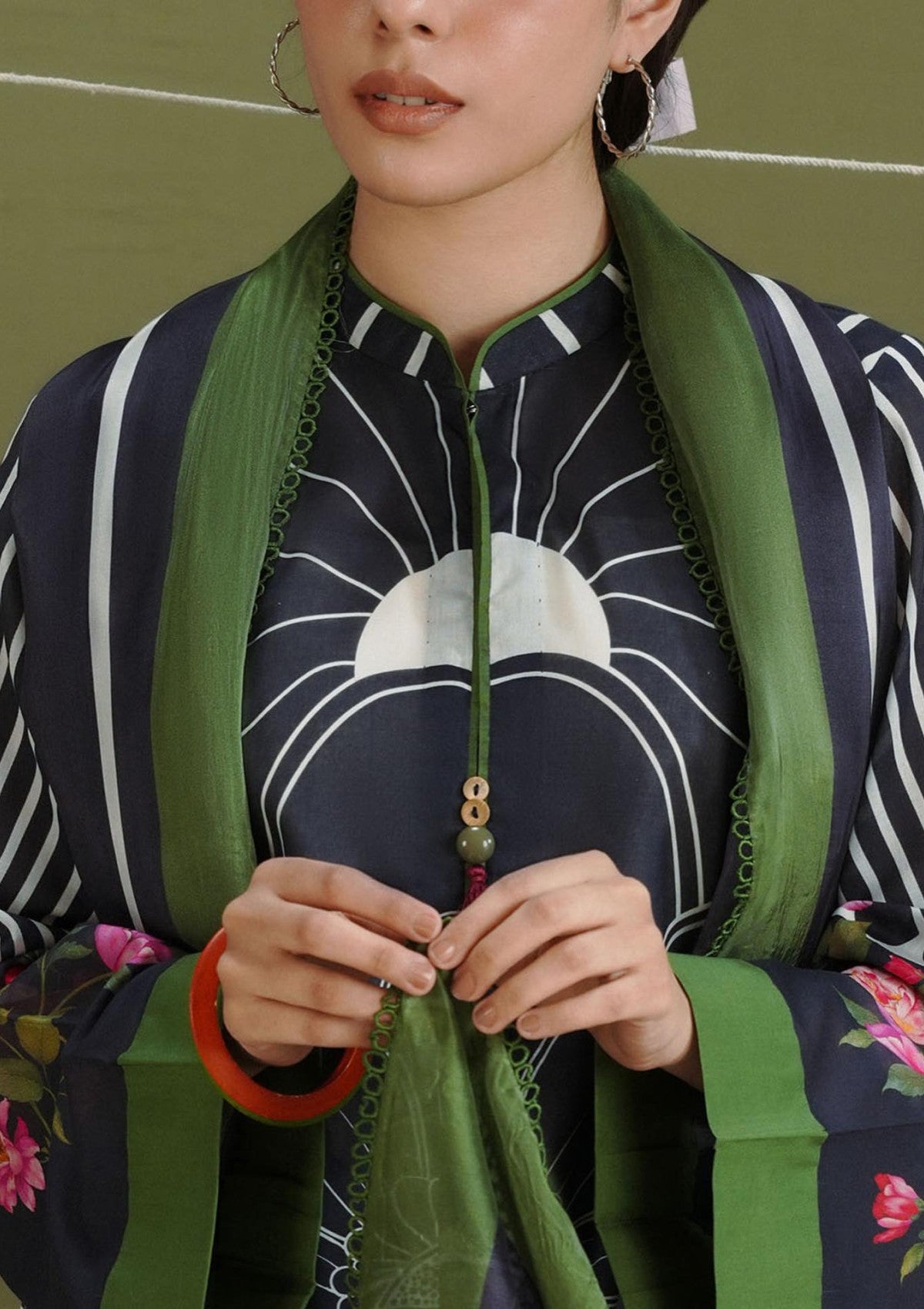 The dupatta is printed in midnight blue with paisley motifs and a moss green border. The shirt features midnight blue and white art nouveau inspired prints. The trouser is finished in solid midnight blue.