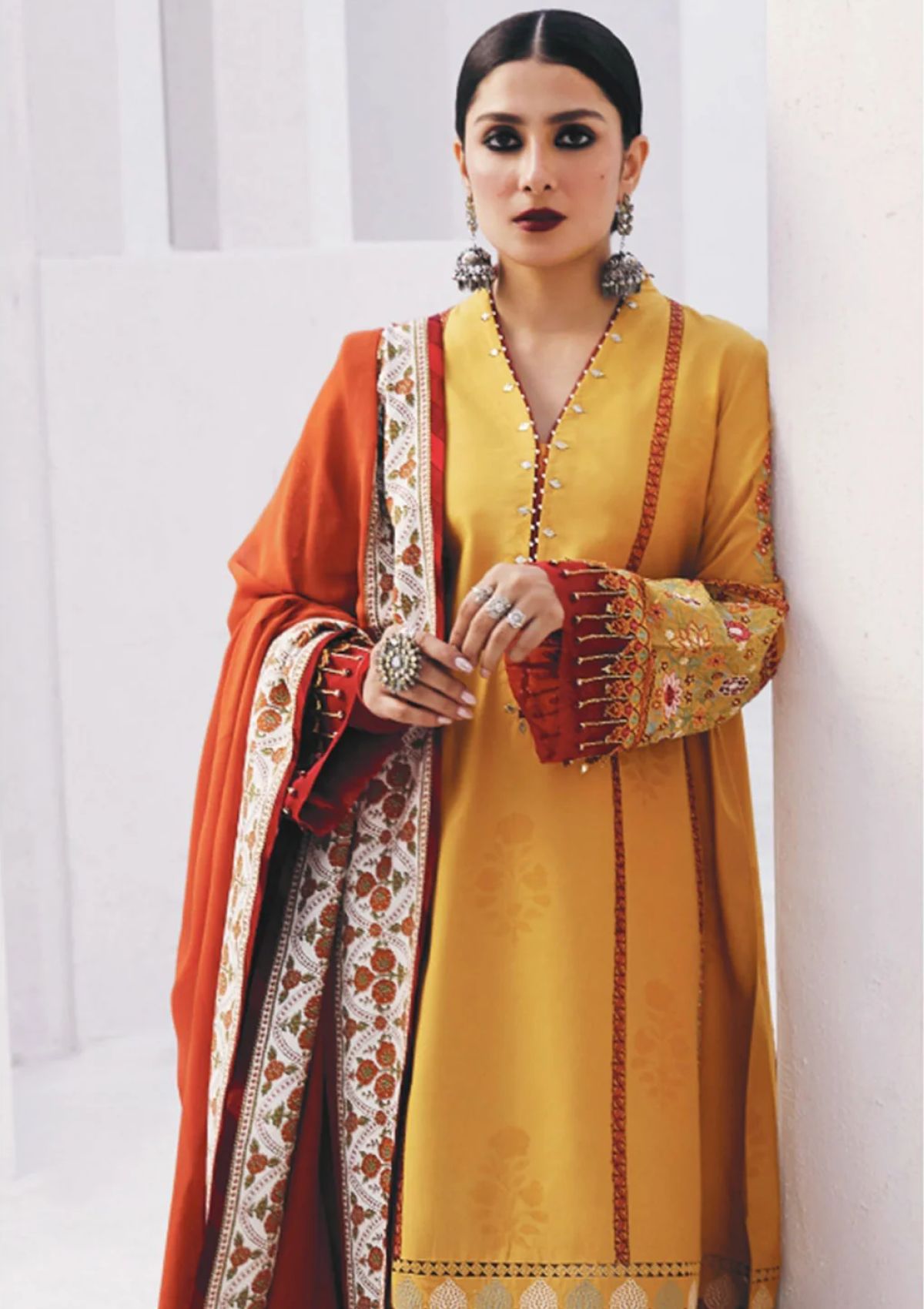 Our Sandal kurta reveals an essence of charm on a jacquard base, styled with a chiffon dupatta and printed silk borders with paste printed pants. The shirt has stunning embroidery on the borders and sleeves.