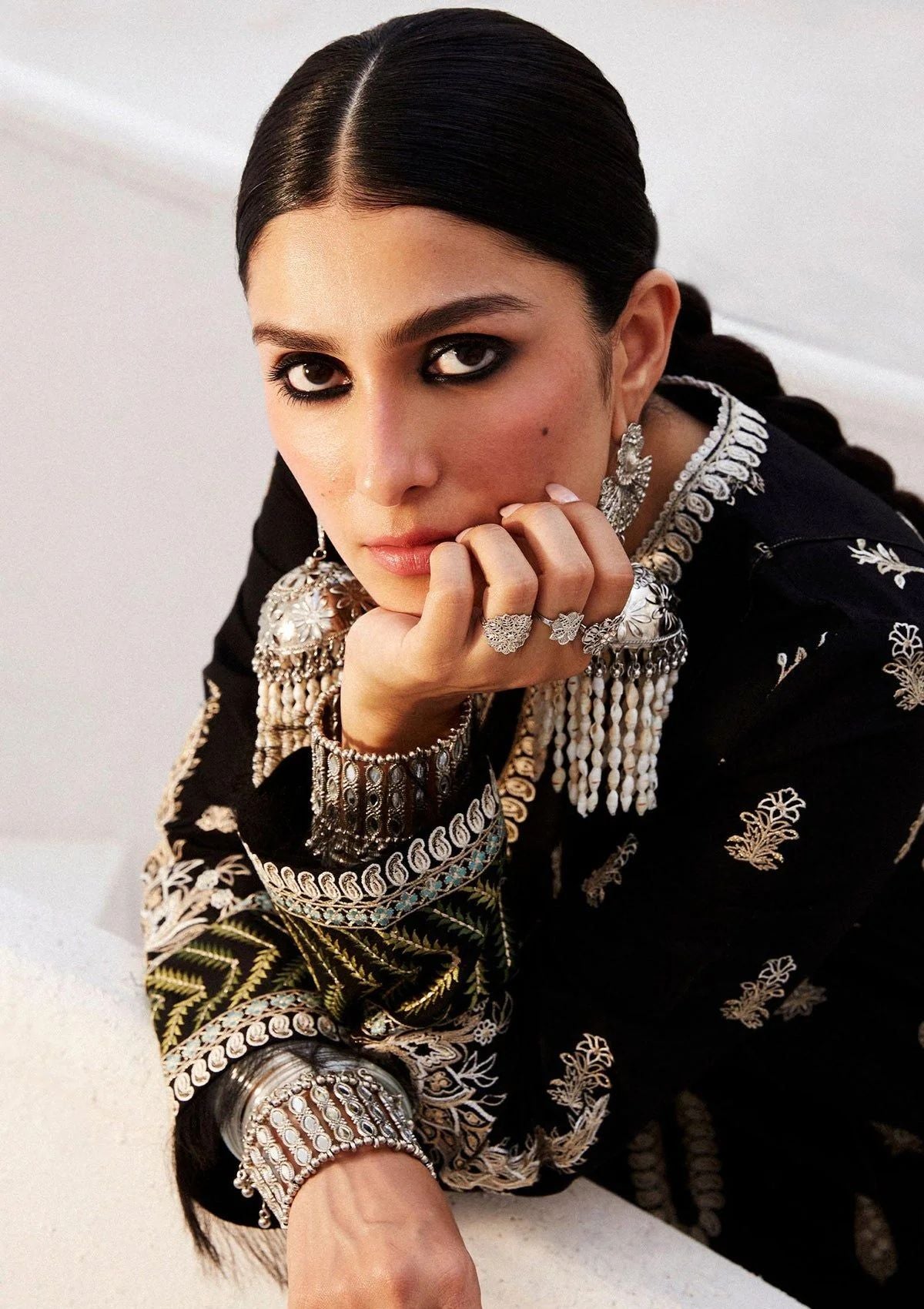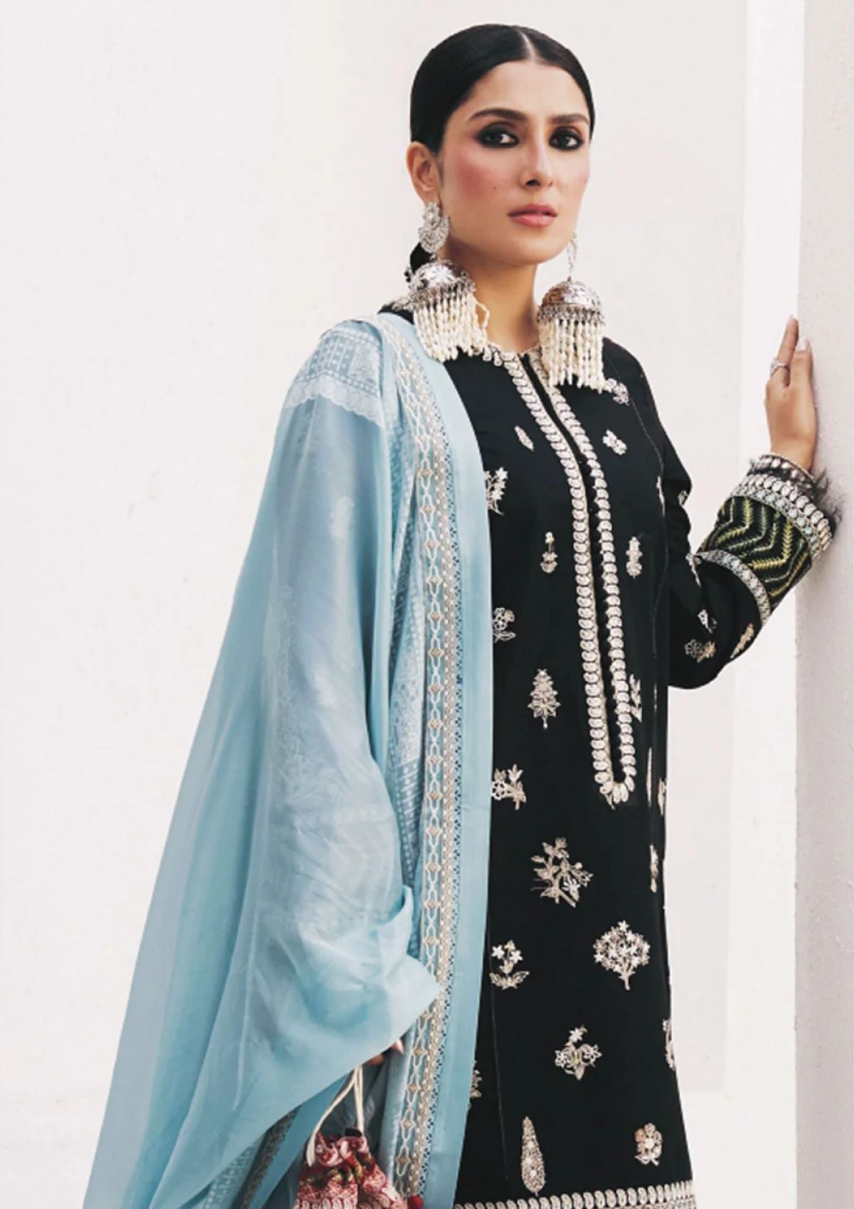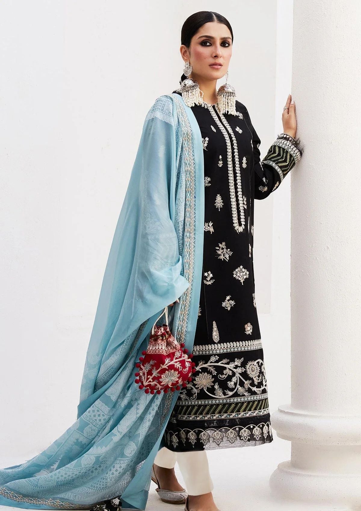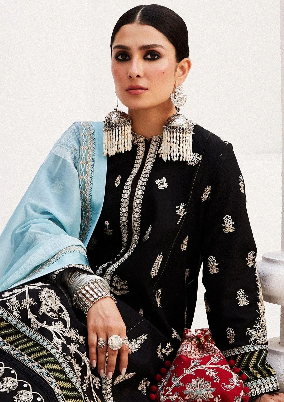Our Myra ensemble steps into a new season featuring a bold colour palette with shikargah motif embroideries, and elaborate borders paired elegantly with a silk dupatta.