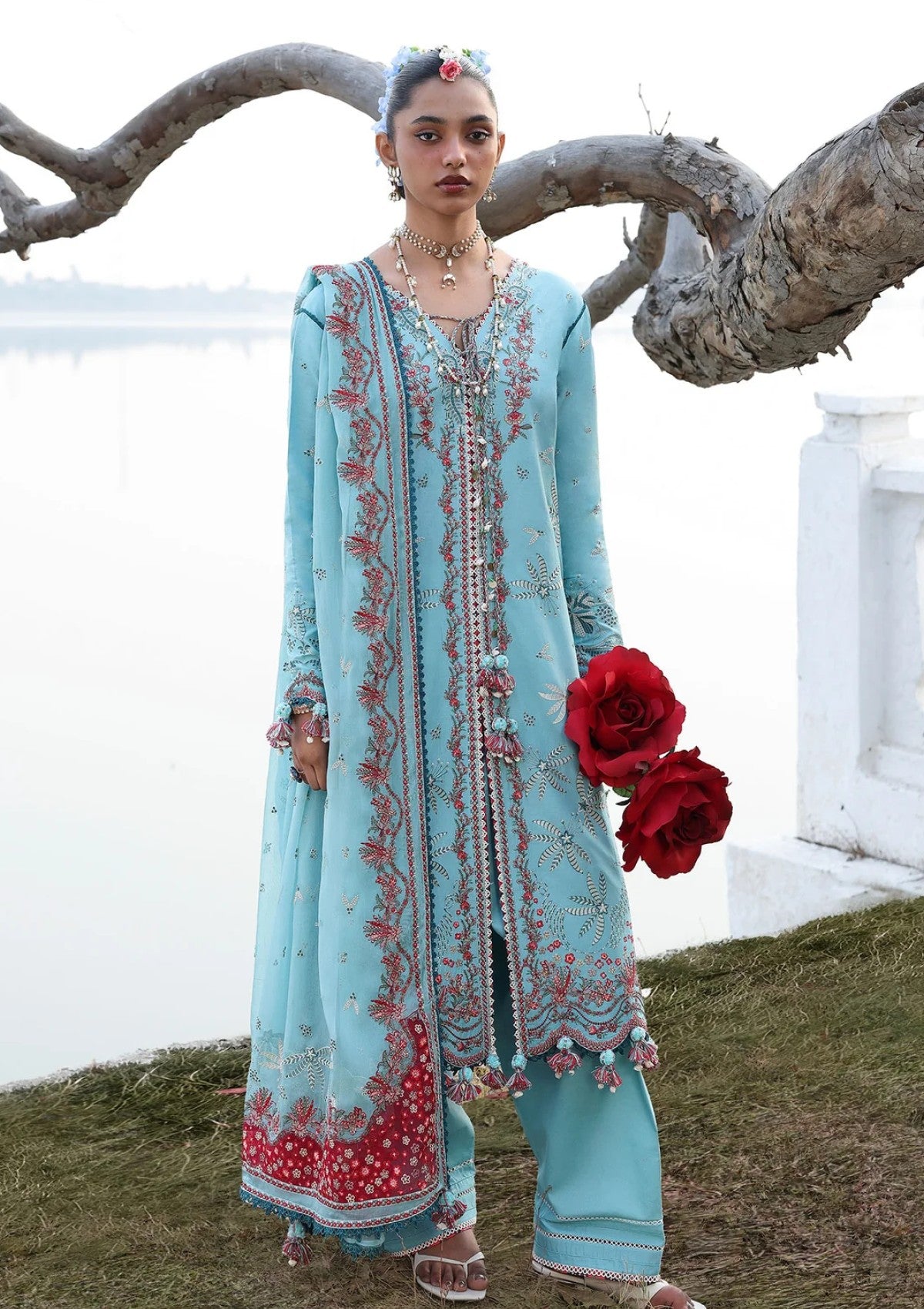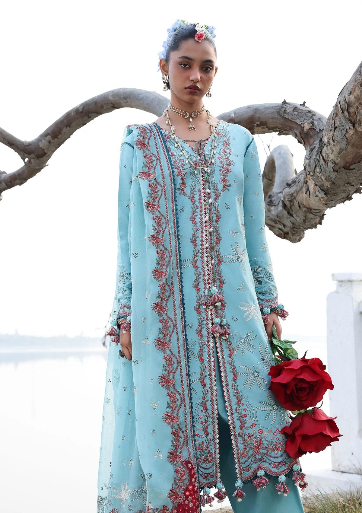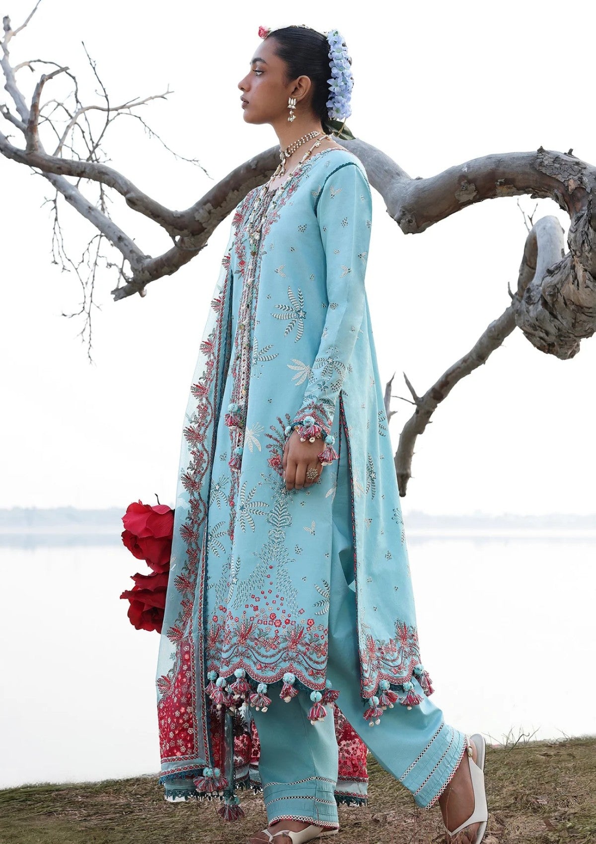 A breezy sky-blue summer ensemble exudes a soft, effortless elegance, artfully accented with a harmonious blend of red, blue, and off-white embroidered tones. The subtle interplay of colors creates a calm, mellow aesthetic while adding depth and visual charm. Completing the look is a lightweight sky-blue chiffon dupatta, enhanced with delicate red organza patching, lending the outfit a refined contrast and an airy, feminine finish—perfect for warm, sun-drenched days.