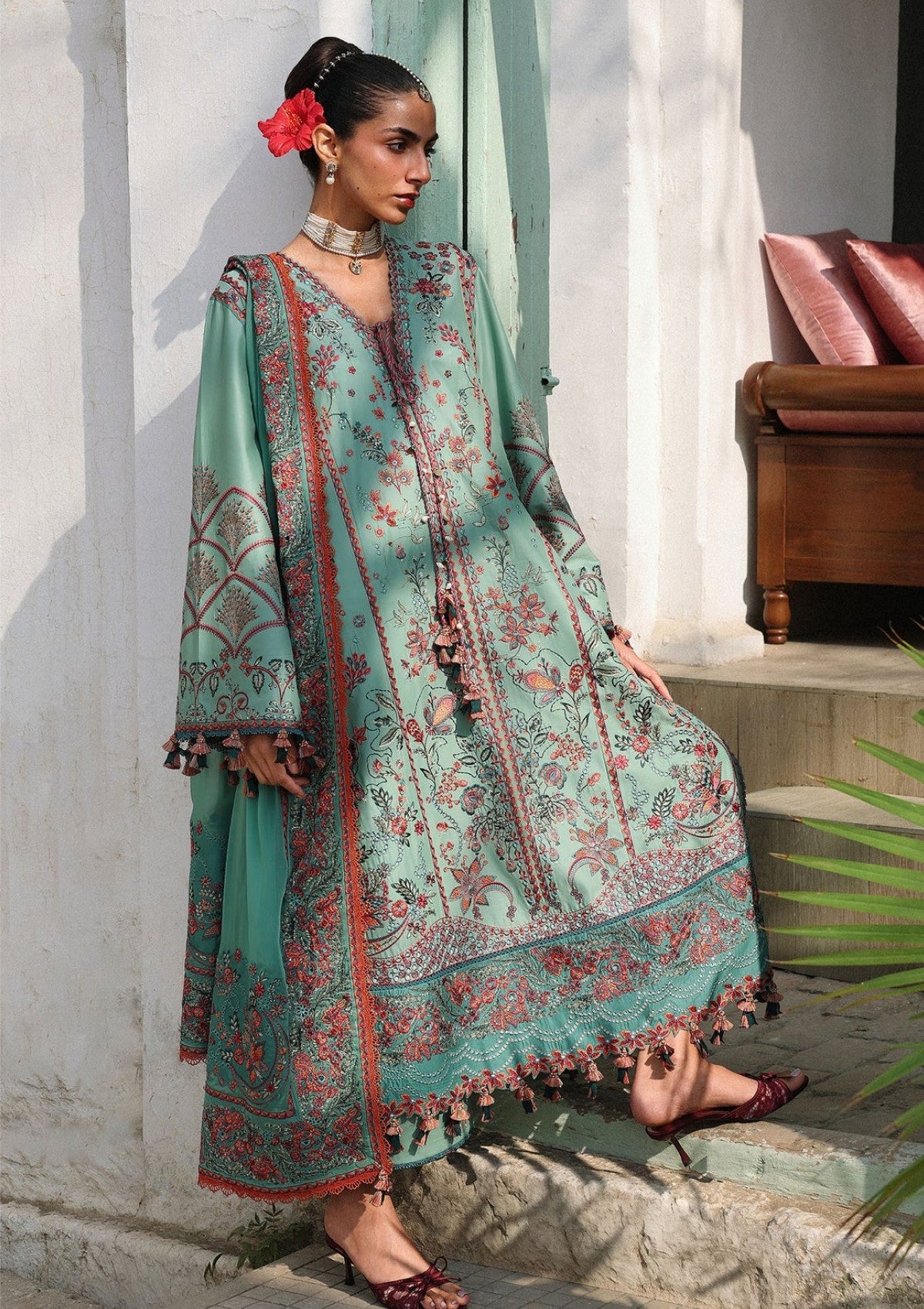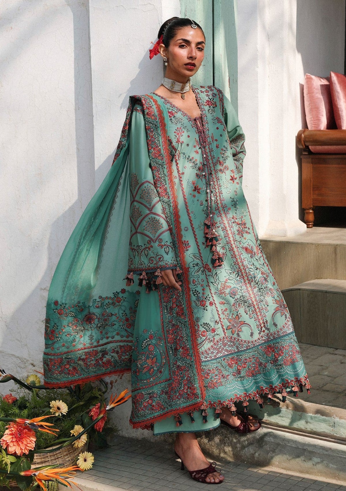 An exquisite aqua green luxury lawn ensemble designed to embody freshness, elegance, and refined craftsmanship. The shirt is beautifully adorned with intricate floral embroidery in soft pink and earthy tones, creating a delicate yet statement-making appeal. Enhanced with finely detailed borders and elegant accents, the design reflects timeless artistry with a modern touch. Paired with a gracefully embroidered matching dupatta, the flowing silhouette and premium lawn fabric ensure comfort without compromising on luxury. Ideal for festive wear, summer soirées, and daytime celebrations, this ensemble captures effortless sophistication and serene char