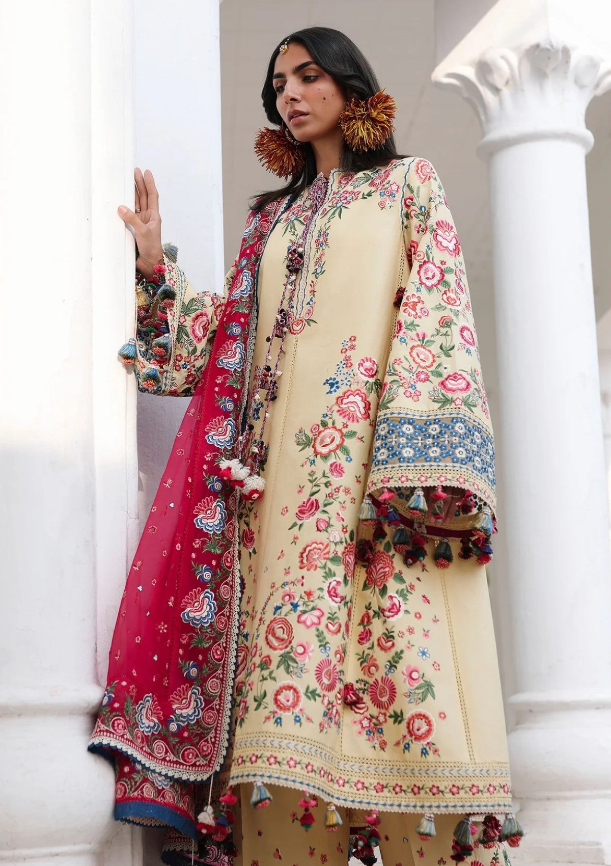 A radiant butter-yellow ensemble comes alive with a playful blend of summery hues, showcased through intricate multicolored embroidery. The lively detailing adds depth and character, creating a fresh and joyful aesthetic. Paired with a striking fuchsia pink chiffon dupatta, finished with a beautifully embroidered four-sided border in complementary colors, this ensemble makes a bold yet elegant statement—perfect for bright summer days and festive gatherings.