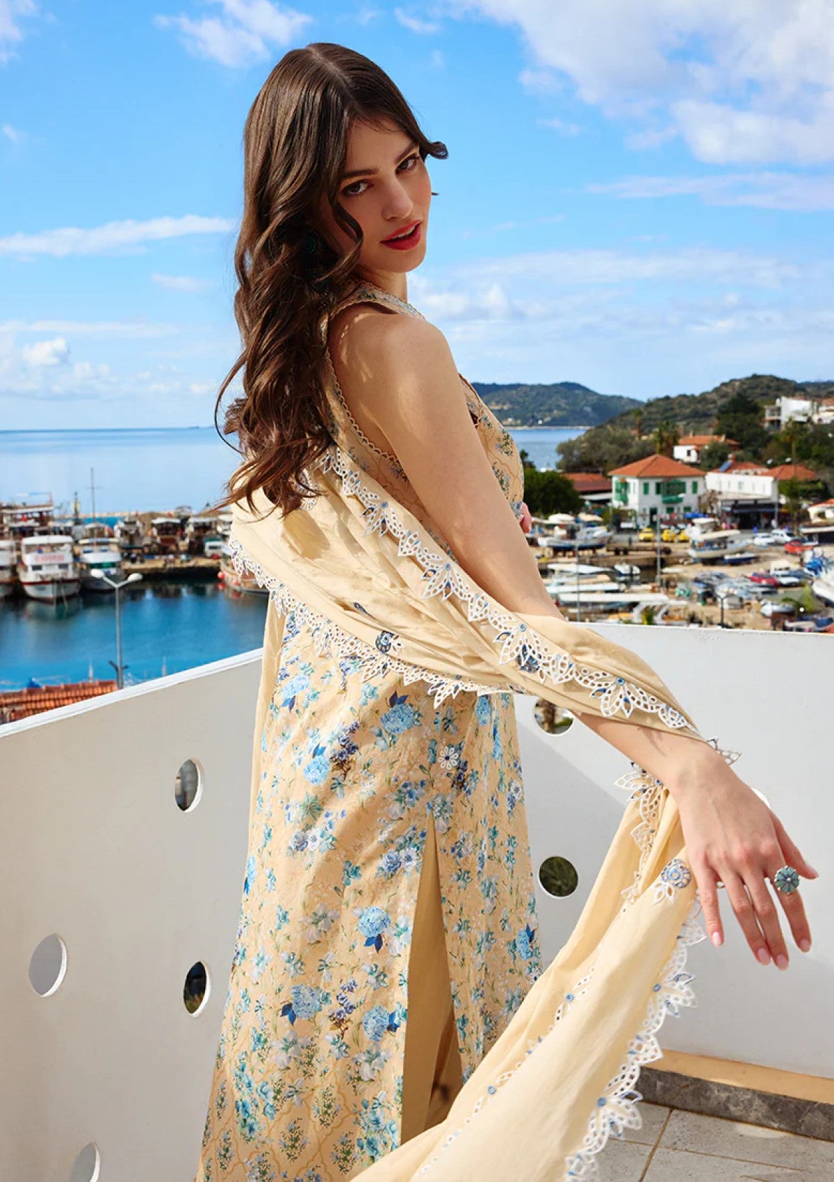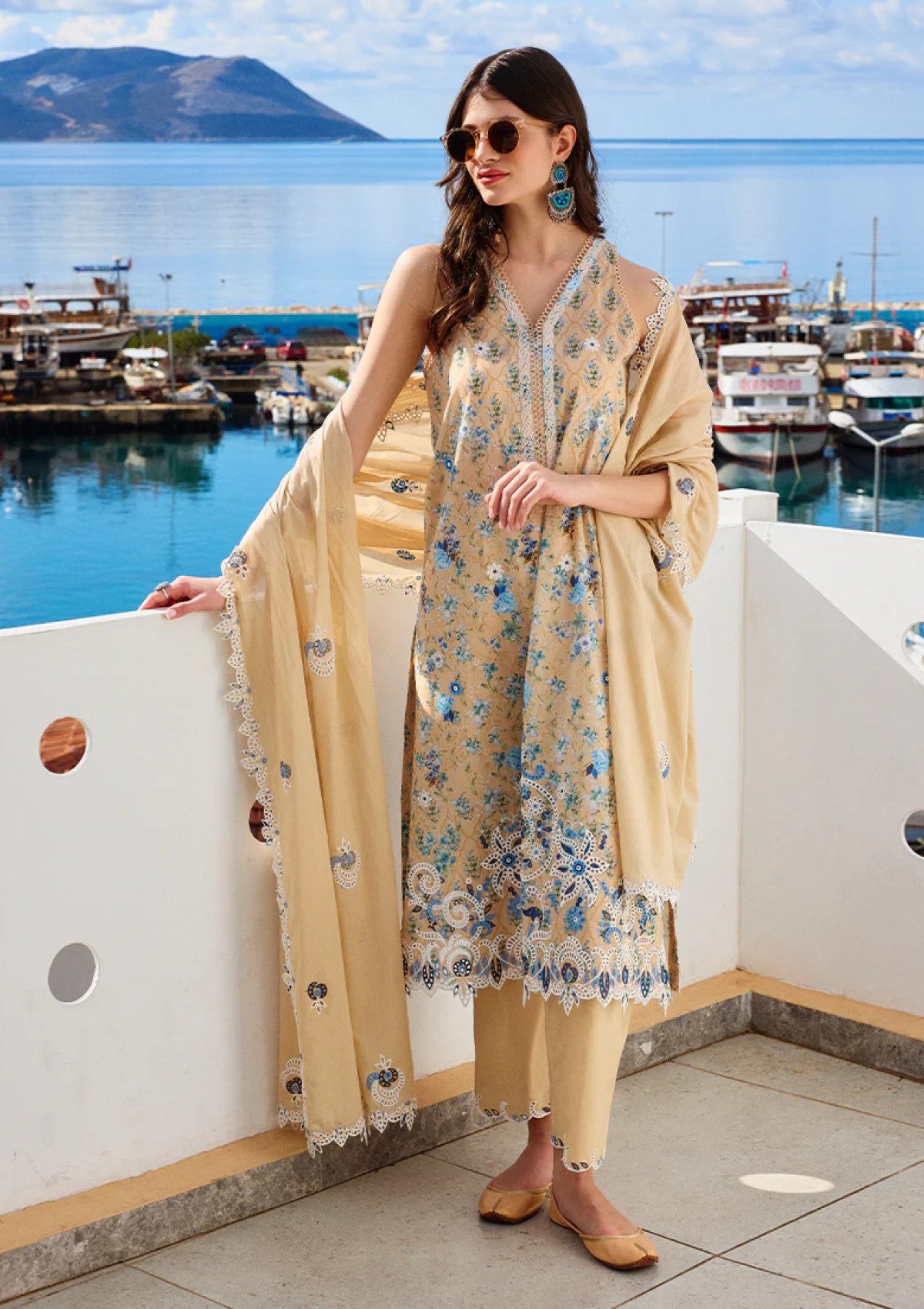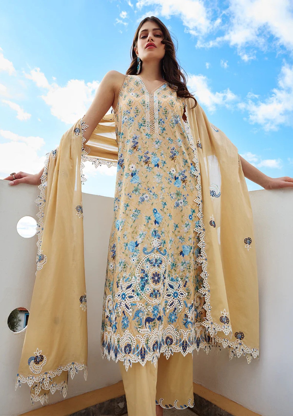 Simaaya in Beige from our Spring Printkari '25 Collection. A printed cutwork embroidered cotton 3-piece outfit paired with dyed voile embroidered dupatta.