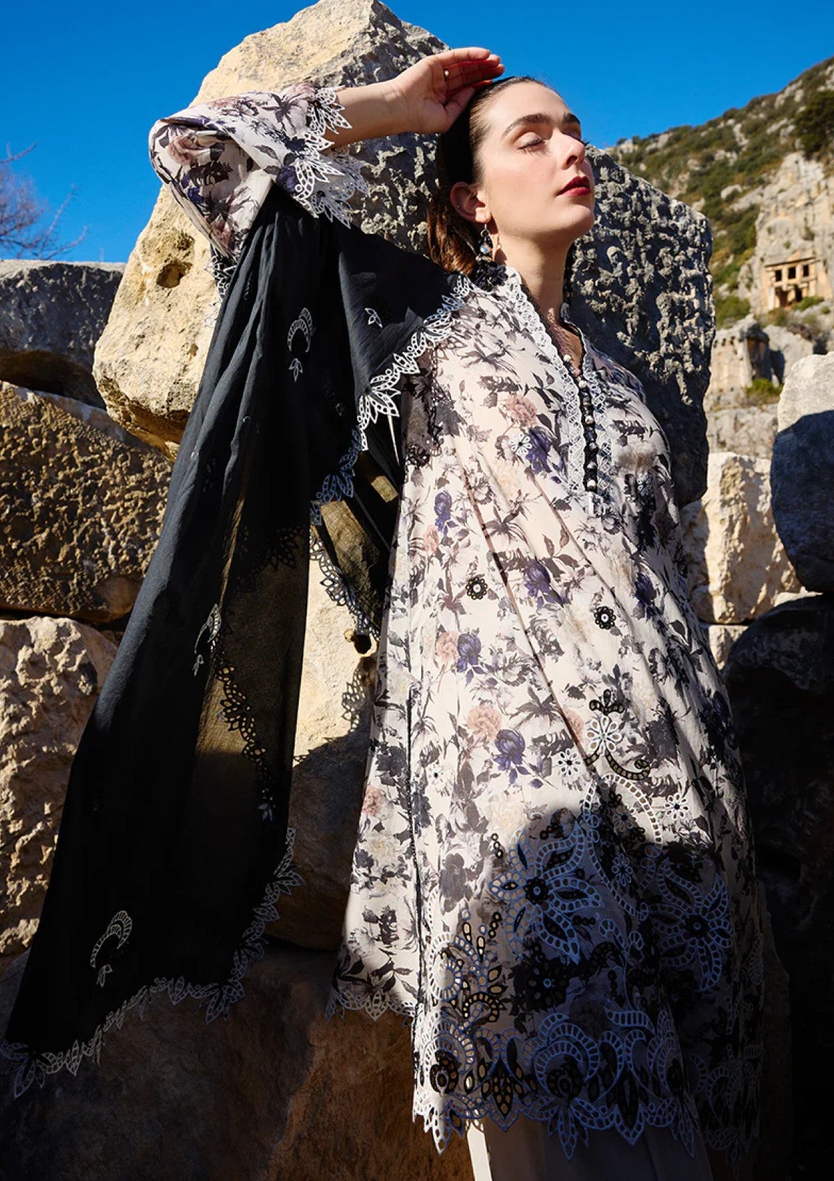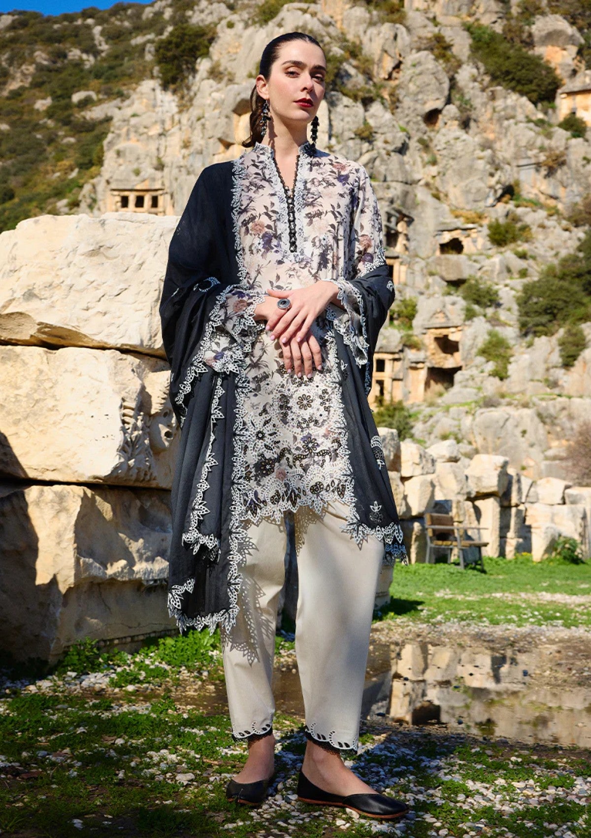 Perihan in Ivory from our Spring Printkari '25 Collection. A printed cutwork embroidered cotton 3-piece outfit paired with dyed voile embroidered dupatta.