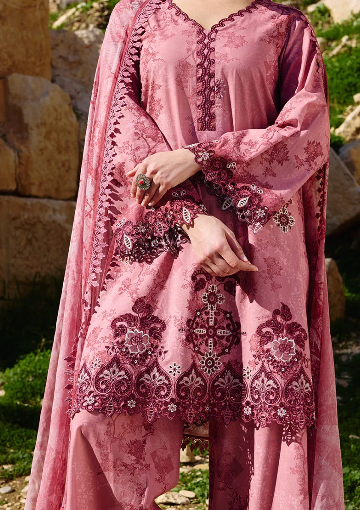 Ivana in Garnet Pink om our Spring Printkari '25 Collection. A printed cutwork embroidered cotton 3-piece outfit paired with digital printed chiffon dupatta.