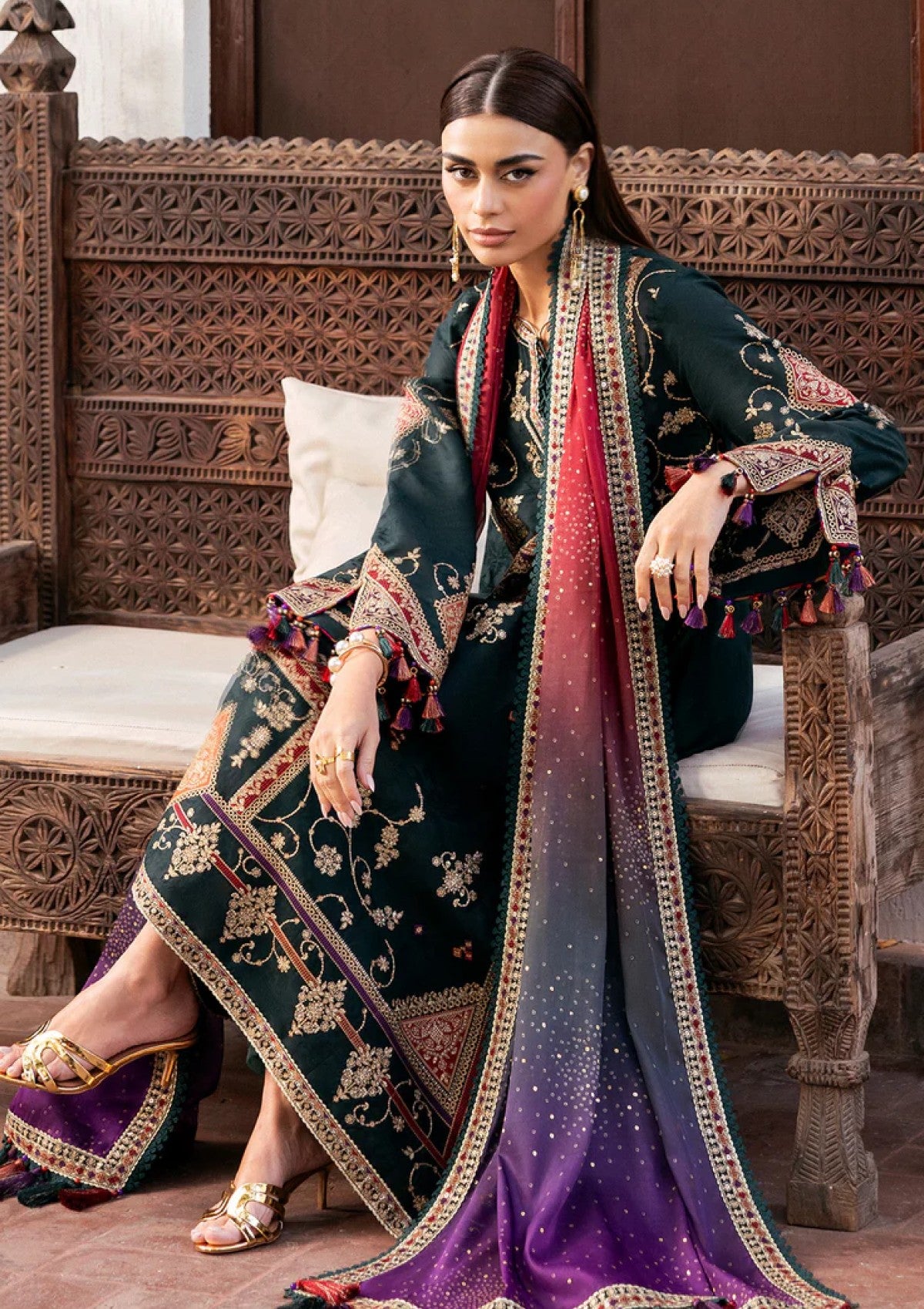 Discover unparalleled luxury with this premium lawn ensemble, showcasing exquisite jacquard craftsmanship throughout. The embroidered jacquard front features intricately detailed side panels, while matching embroidered sleeves demonstrate superior artisanal work. The dyed jacquard back provides elegant depth, framed by ornate embroidered borders on both front and back. A dyed cambric bottom grounds the silhouette with understated sophistication. This collection includes coordinating dupatta—a digital printed foil tissue silk dupatta for glamorous occasions and an embroidered organza dupatta with refined borders for versatile styling. An exceptional choice for those who appreciate meticulous craftsmanship and timeless design.