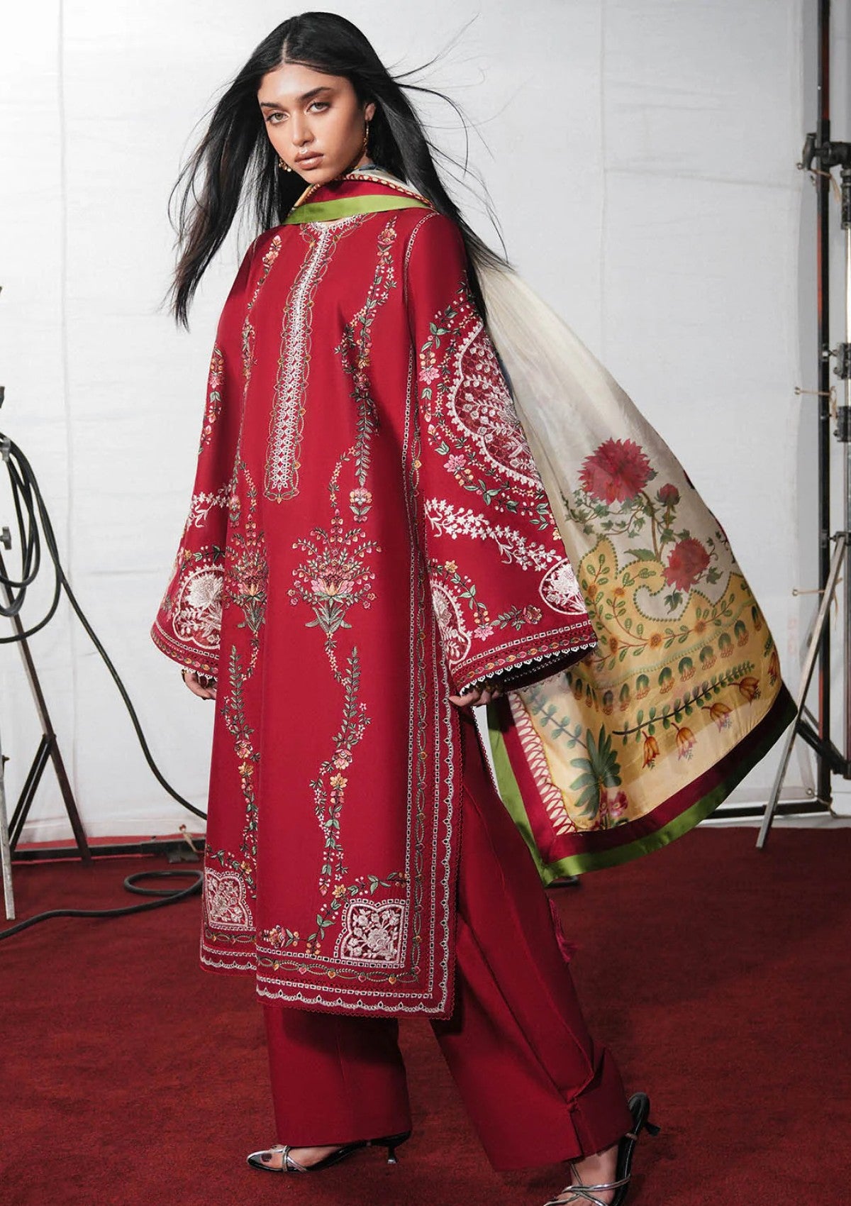 A classic red long shirt adorned with multicolor floral embroidery is paired with beautifully detailed bell sleeves, featuring monochrome embroidered organza patches for an added touch of refinement. The look is completed with a red, dyed pleated trouser that adds structure and flow, while a digital printed silk dupatta brings in a soft contrast and elevates the ensemble with a contemporary finish.