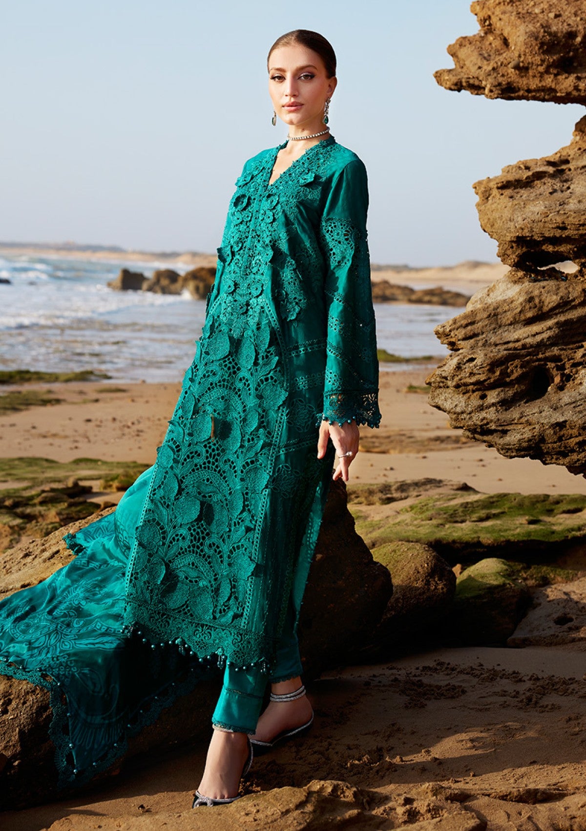 Embroidered Jacquard Lawn Left Panel With 3D Flowers & Pearls