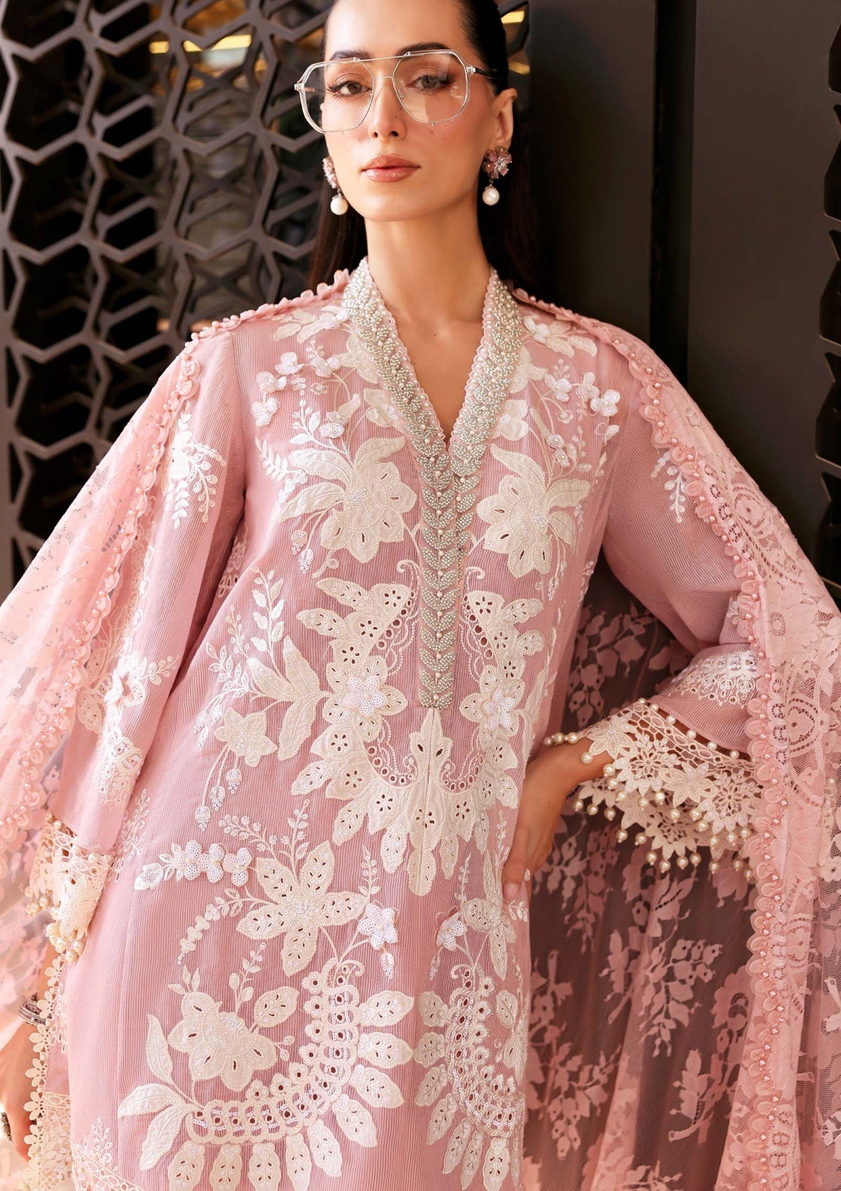 Embroidered Lawn Karandi Sleeves R+L With 3D Flowers & Pearls