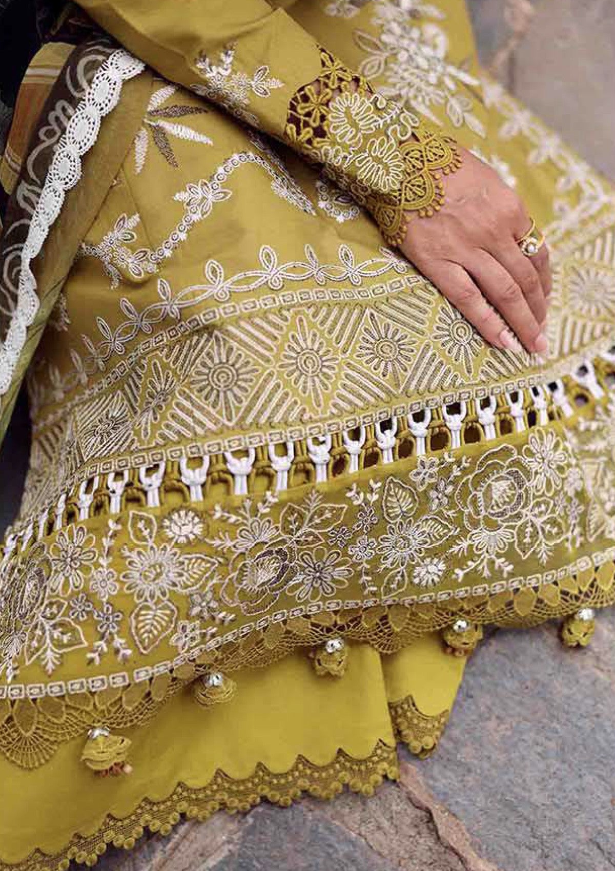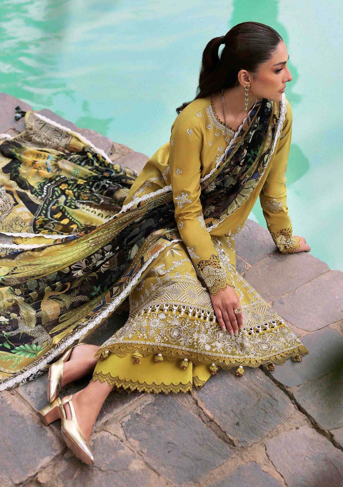 Elegantly crafted, this three-paneled shirt features a rich mustard base adorned with intricate white floral embroidery, delicately accented with shimmering tila work. The ensemble is paired with a chiffon dupatta showcasing a regal shikargah motif, adding a touch of refined sophistication.