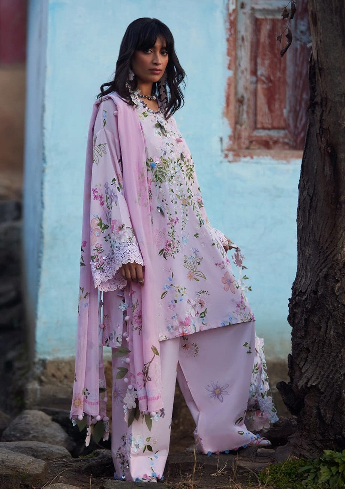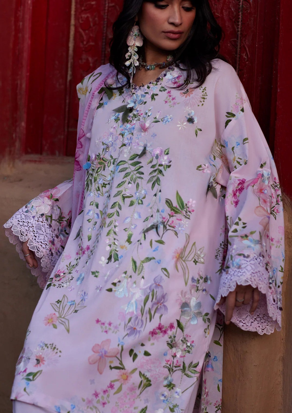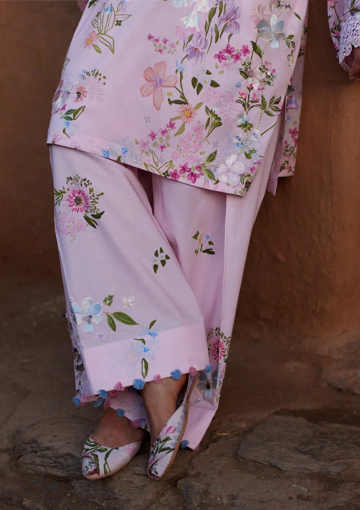 A romantic reinterpretation of jiā (佳), this blush-toned edition softens the silhouette in a delicate wash of rose quartz pink. The airy base is adorned with scattered pastel florals in lilac, sage, powder blue, and soft coral, creating the feeling of petals drifting across a spring sky. Intricate thread embroidery cascades gently along the front, forming blooming vines that add quiet texture and dimension. The relaxed kurta silhouette is elevated with wide, lace-trimmed sleeves, bringing a touch of vintage femininity and graceful movement. Paired with fluid coordinating trousers touched with subtle floral accents, the ensemble is completed with a flowing printed chiffon dupatta, light, sheer, and effortlessly draped, echoing the softness of the palette. In this blush colorway, JIĀ feels tender and luminous, a portrait of soft beauty wrapped in modern romance
