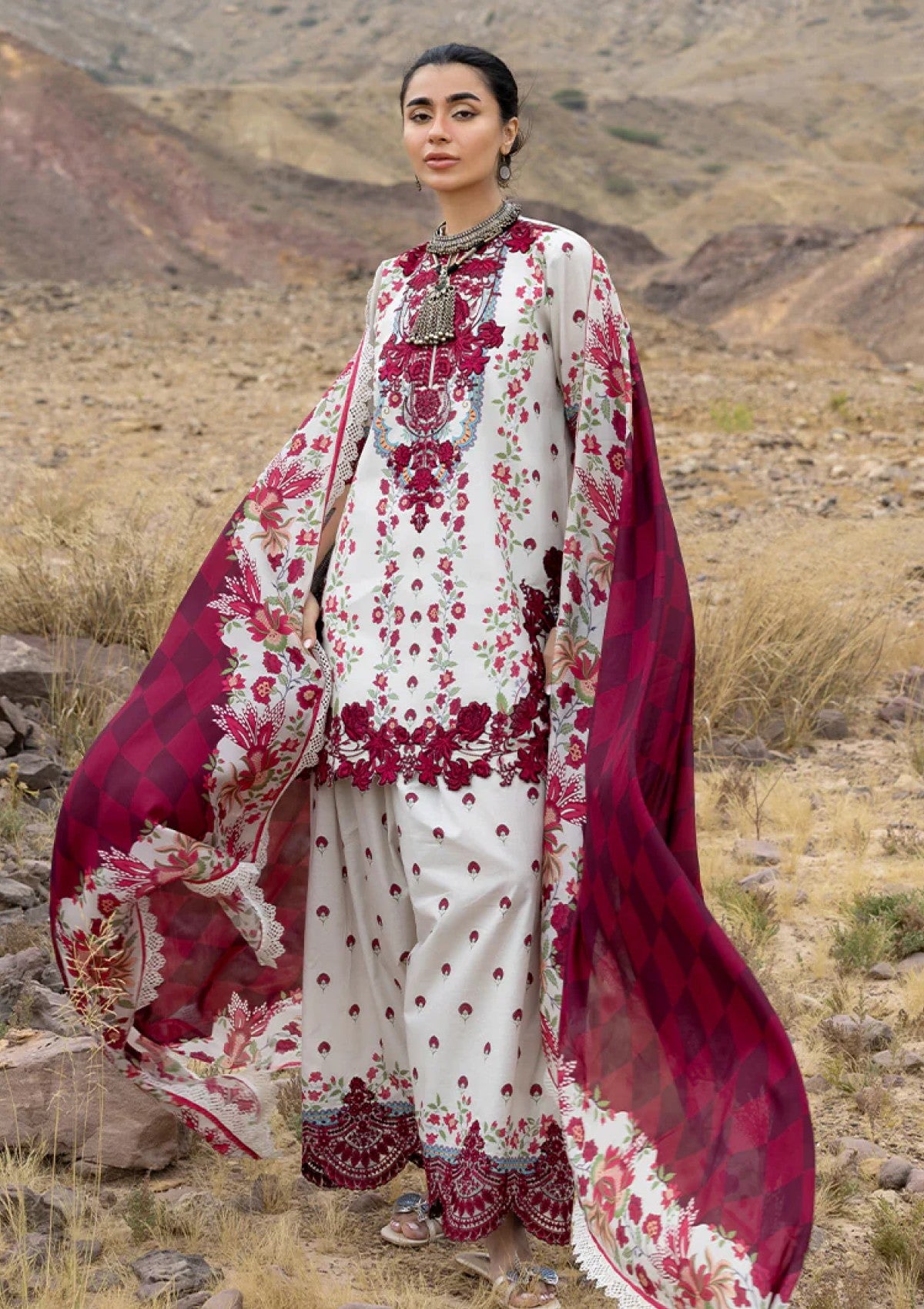 This half-length white kameez features intricate cherry-red embroidery along the neckline, borders, and hem, paired with matching flowy pants. A light, open dupatta completes the look, creating a breezy and elegant ensemble perfect for festive occasions.