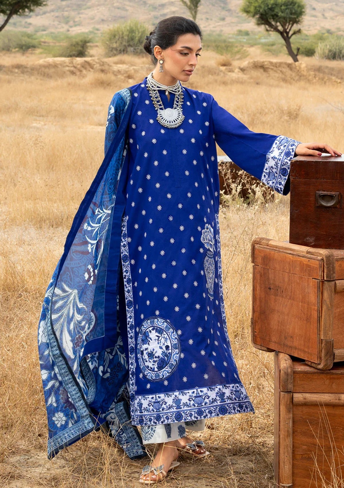 This navy blue chikankari kameez blends bold graphic artistry with intricate craftsmanship. The half-length silhouette features a V-neckline with softly undulating edges and long open sleeves, finished with chunky white embroidery accented with subtle navy detailing. A large circular motif and a stylized vase design adorn the front, creating a statement yet elegant look. The open white shalwar, sprinkled with delicate navy embroidery, balances the ensemble, while the flowing dupatta completes the design with ethereal movement. Modern, refined, and effortlessly graceful, this piece embodies artistic luxury with timeless appeal.