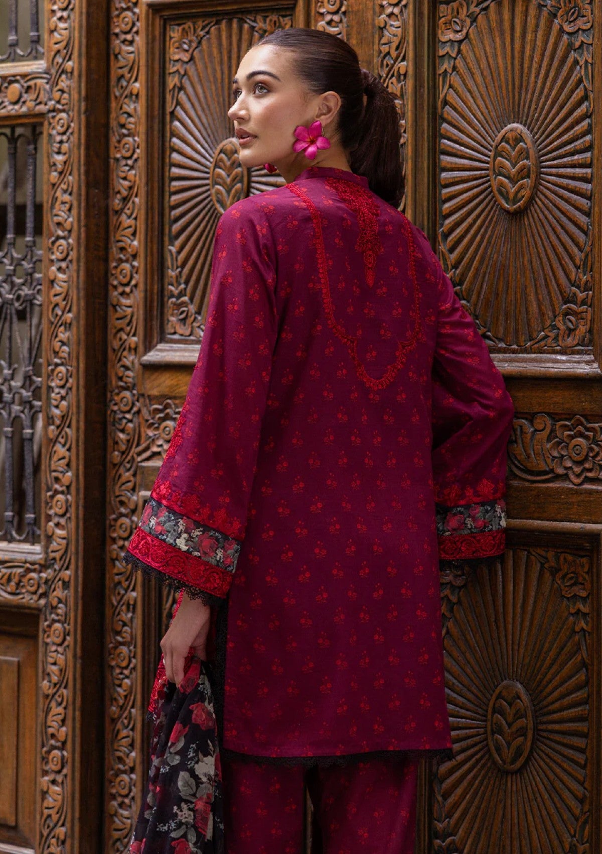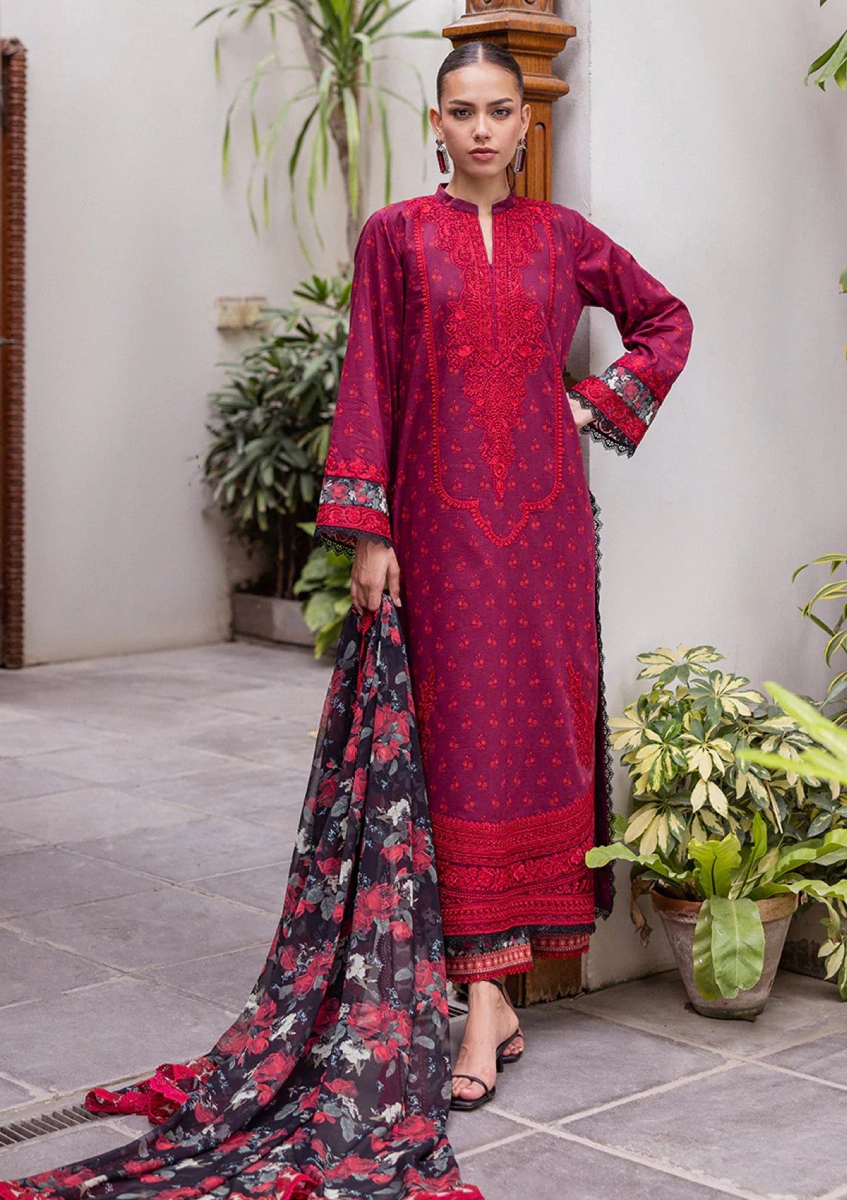 Experience scarlet grandeur with ayra, an unstitched piece from Zainab Chottani's exclusive Lawn Collection. The shirt is a vibrant statement in deep scarlet lawn, generously embellished with an all- over, intricate embroidery in matching red tones, creating a rich texture on the neckline, full sleeves, and detailed hemline. The final touch of opulence is added by the lightweight chiffon dupatta, which features a captivating print of lush red flowers on a dark, elegant background.