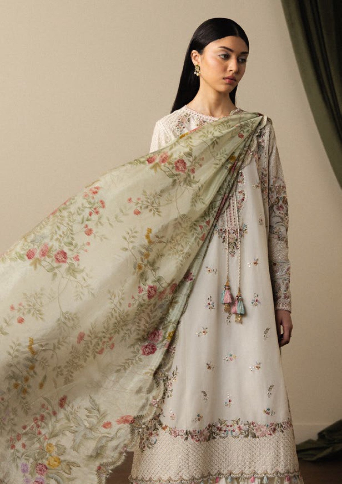 Shiori is crafted in off-white with chintz floral and paisley-inspired prints, paired with a pistachio green printed dupatta. Detailed with embroidered panels, organza borders, and matching cambric trousers, the ensemble embodies understated sophistication and heritage rooted charm.