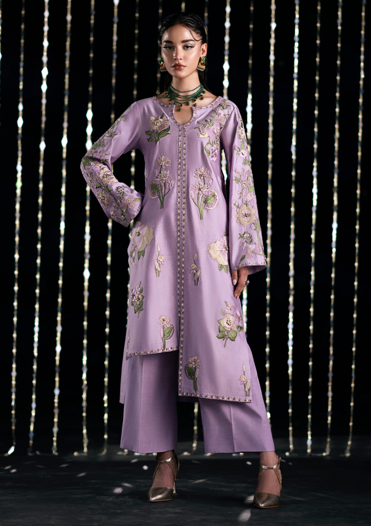 The lilac cotton net shirt is adorned with embroidered floral bunches, intricately embellished for a touch of refined elegance. The neckline to hemline features a carefully adorned placket, and the straight sleeves continue the theme with matching embroidery and embellishments. This ensemble is completed with Azar pants.