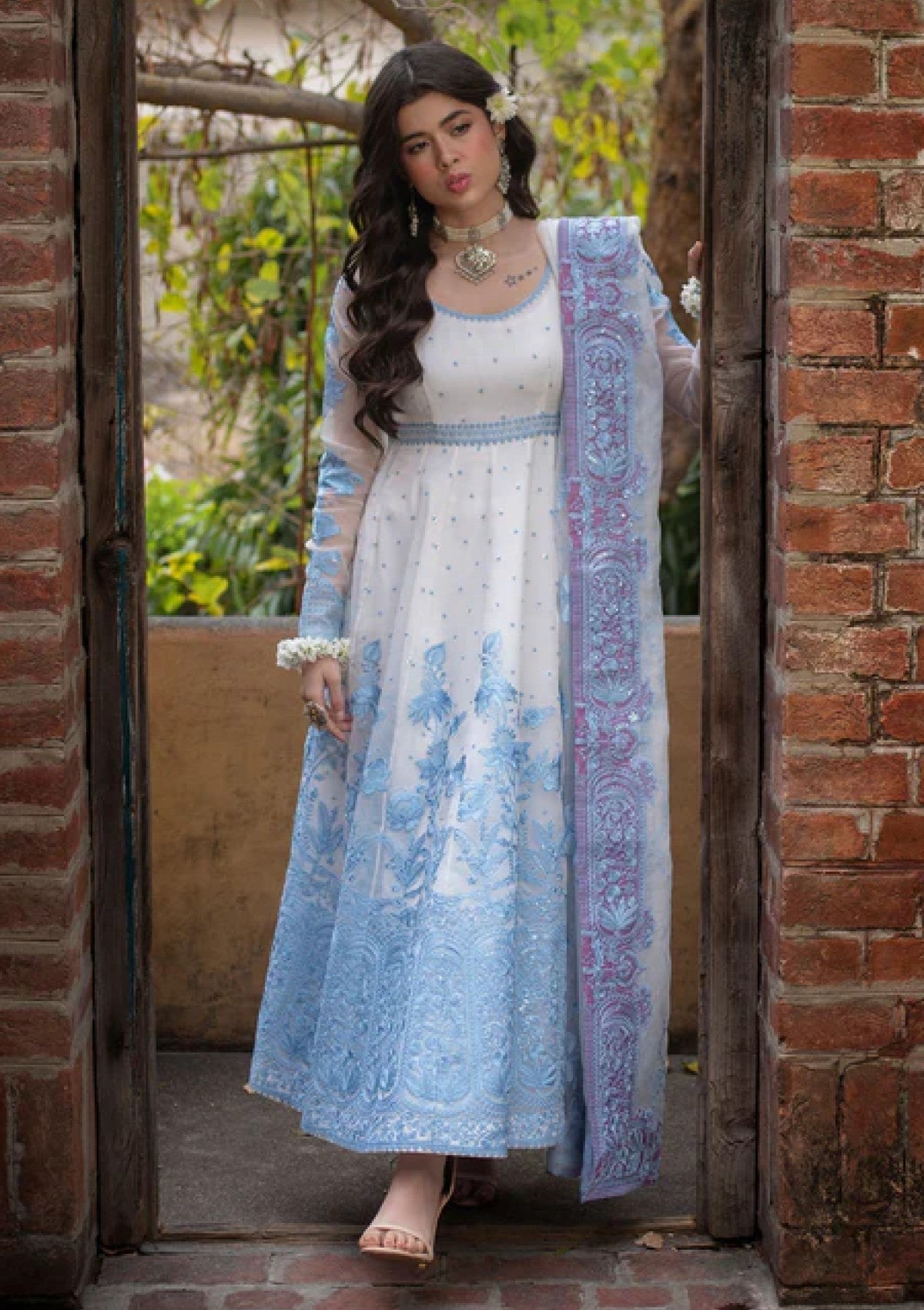 An ivory pishwas set intricately embroidered in maya blue, featuring delicate motifs that adorn the fabric, creating an elegant silhouette.. Paired with an embroidered white organza dupatta, showcasing geometric borders with intricate embroidery, crafted from lightweight organza fabric with a soft, flowing texture.