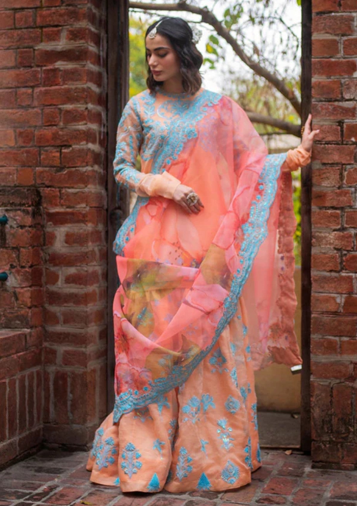 Coral sharara set with maya blue floral embroidery, paired with an embroidered organza dupatta featuring a hand-rendered base and delicate border motifs.