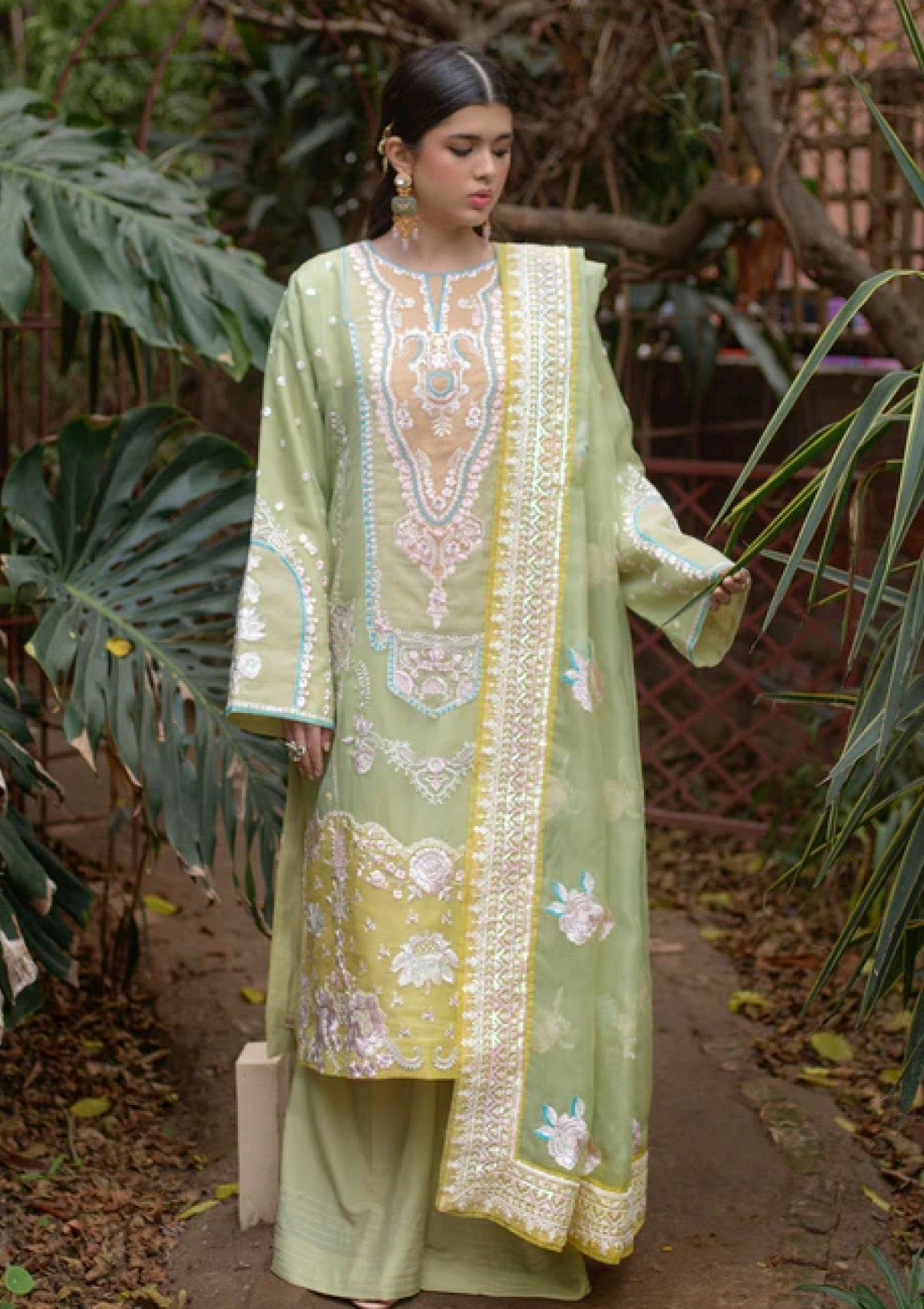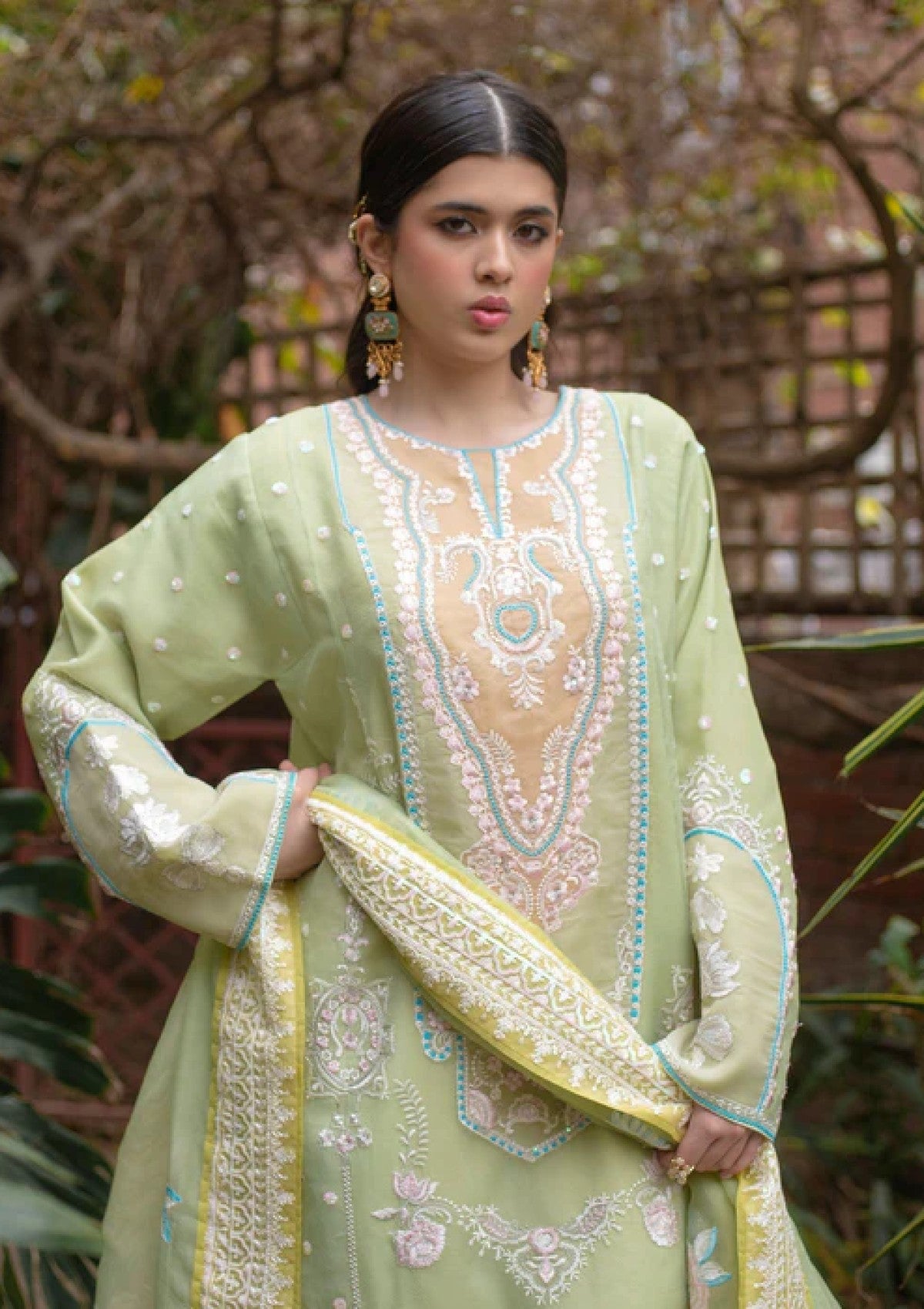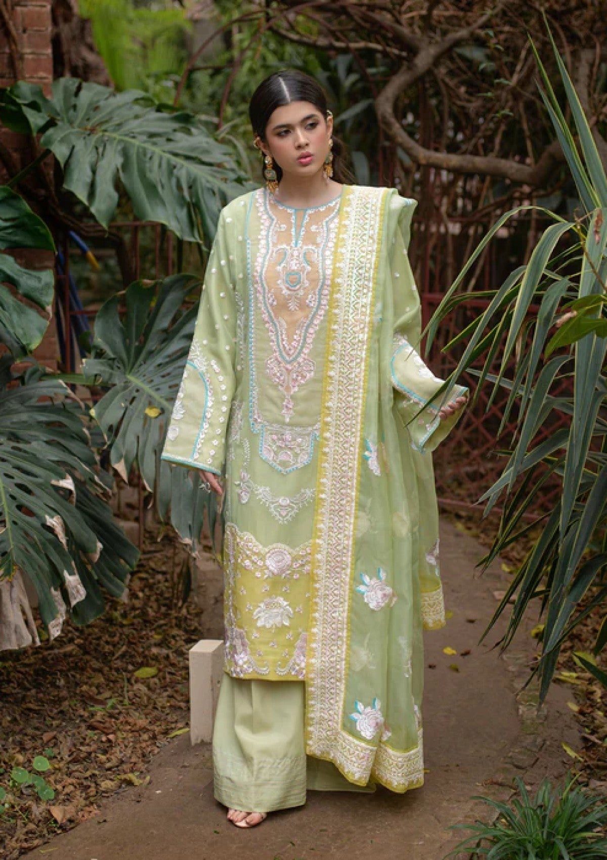 Additional Description: A pistachio long shirt and trouser set, beautifully embroidered with intricate ivory thread work. The classic combination of the pistachio hue and delicate ivory embroidery creates a stunning visual effect. Paired with the set is an elegant organza dupatta, framed with a lovely yellow border that adds a touch of sophistication and refinement to the overall ensemble.