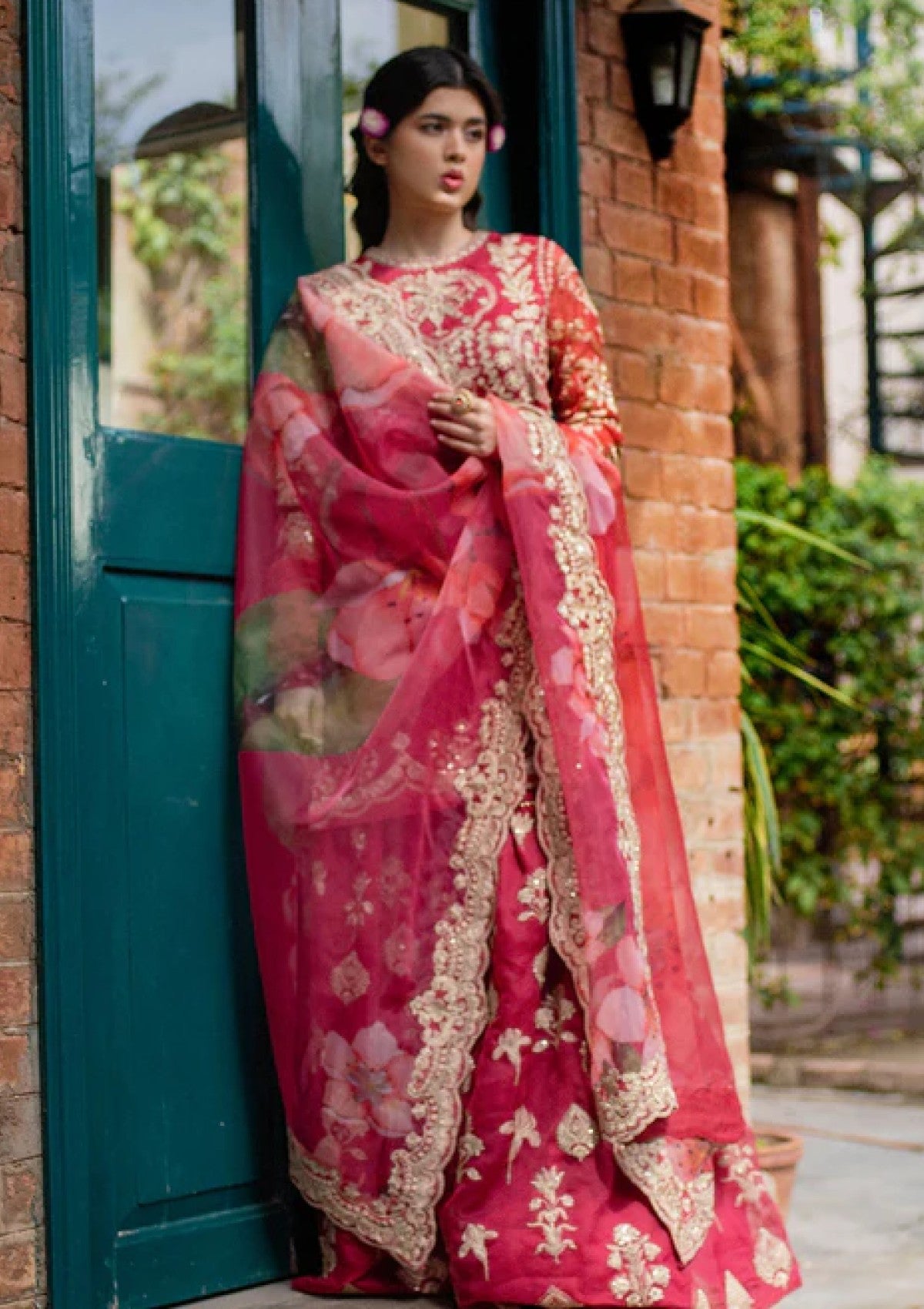 Carnation red sharara set with gold floral embroidery, paired with an embroidered organza dupatta featuring a hand-rendered base and delicate border motifs.