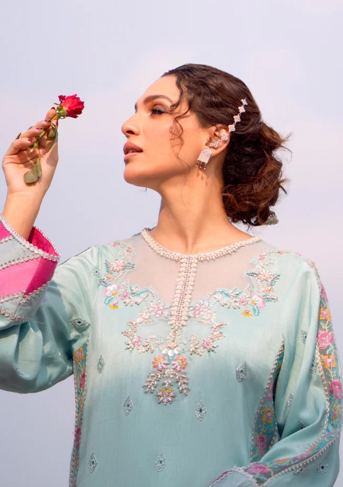 Introducing 'Amber', a stunning ice blue outfit. The sheer organza neckline with elegant embroidery and crystal accents sets a sophisticated tone. The shirt's cross-stitch panel and intricate handwork provide a timeless appeal, highlighted by PK silk chatta patti with tilla lace on the daman and sleeves. Completing the ensemble is a screen printed dupatta with chatta patti and pants adorned with tilla lace and adda work motifs, creating a harmonious blend of heritage and modernity.