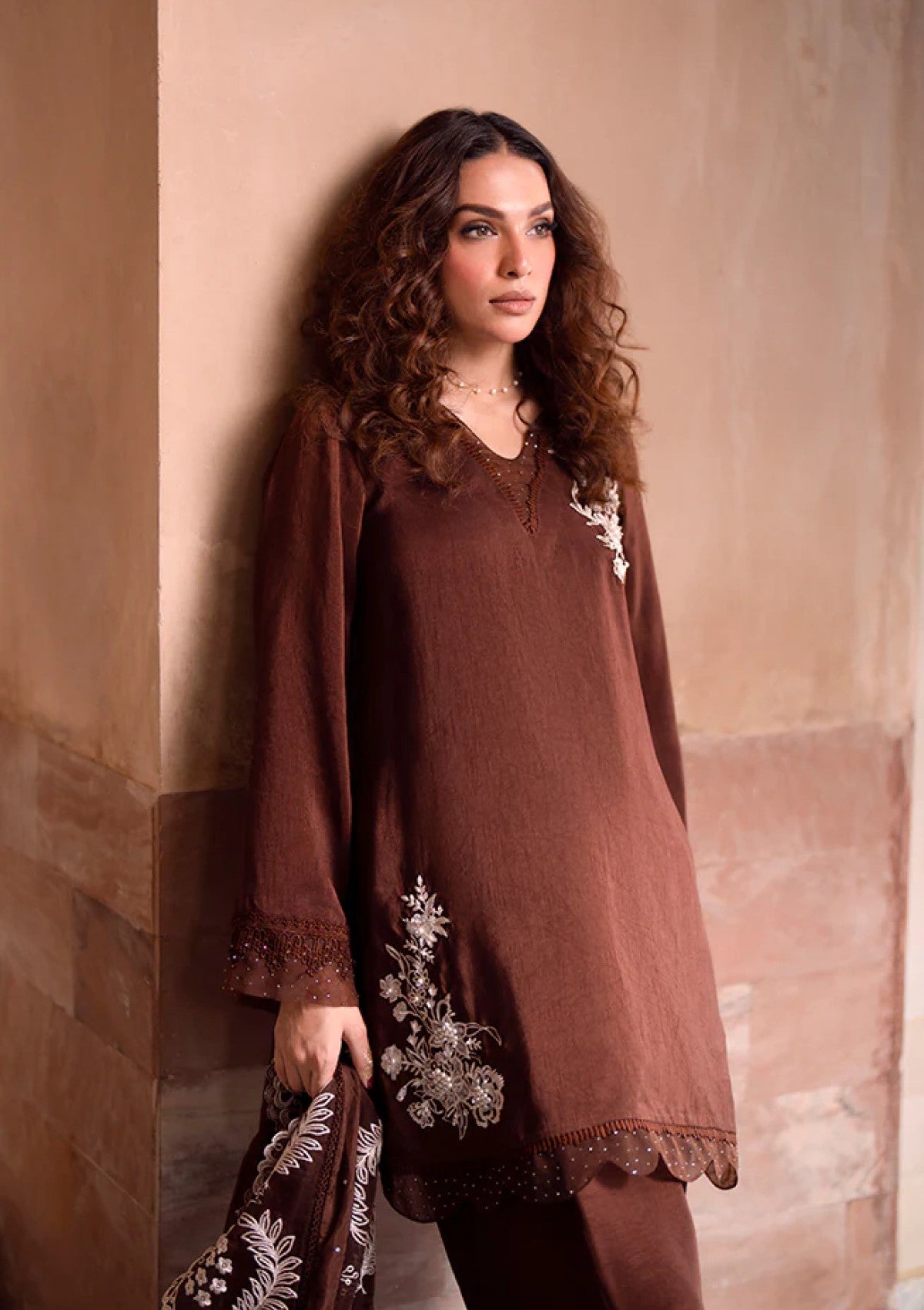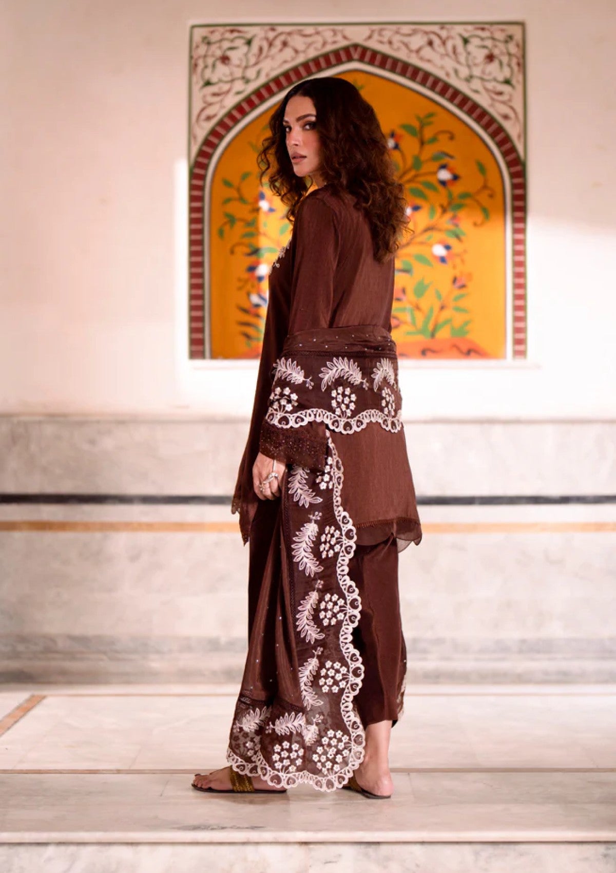 Introducing 'Raniya', a luxurious brown ensemble that merges traditional charm with contemporary allure. Adorned with a lace neckline delicately sprayed with stone, it pairs elegantly with off-white motifs on the shoulders and hem, highlighted by intricate adda work. The ensemble is complemented by a silver stone spray on dupatta and a simple yet refined plain shalwar, offering a perfect blend of heritage and modernity.