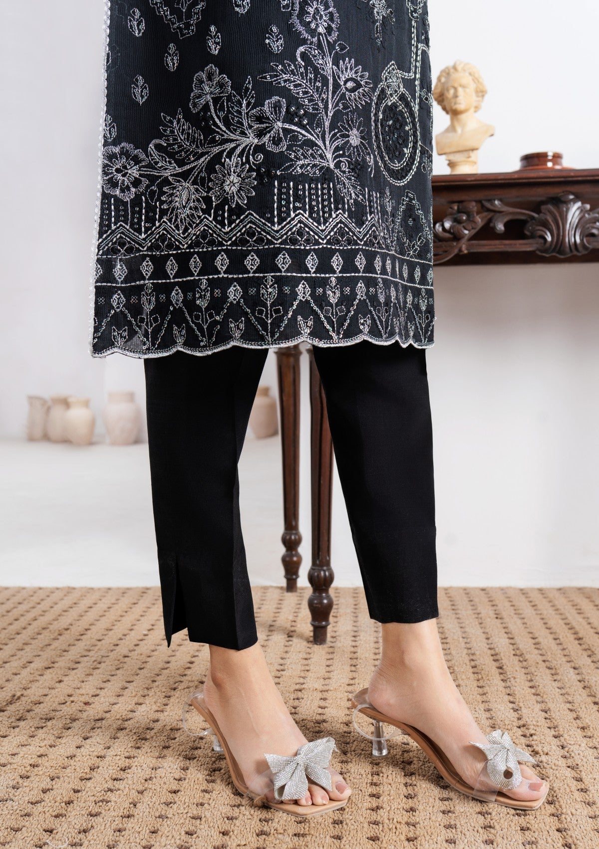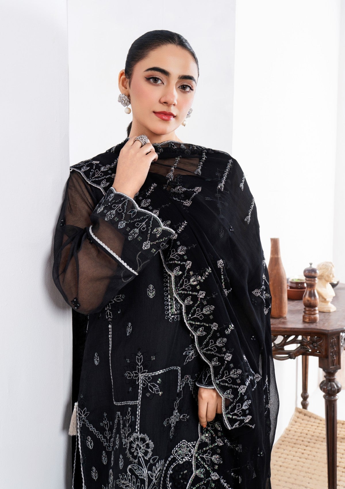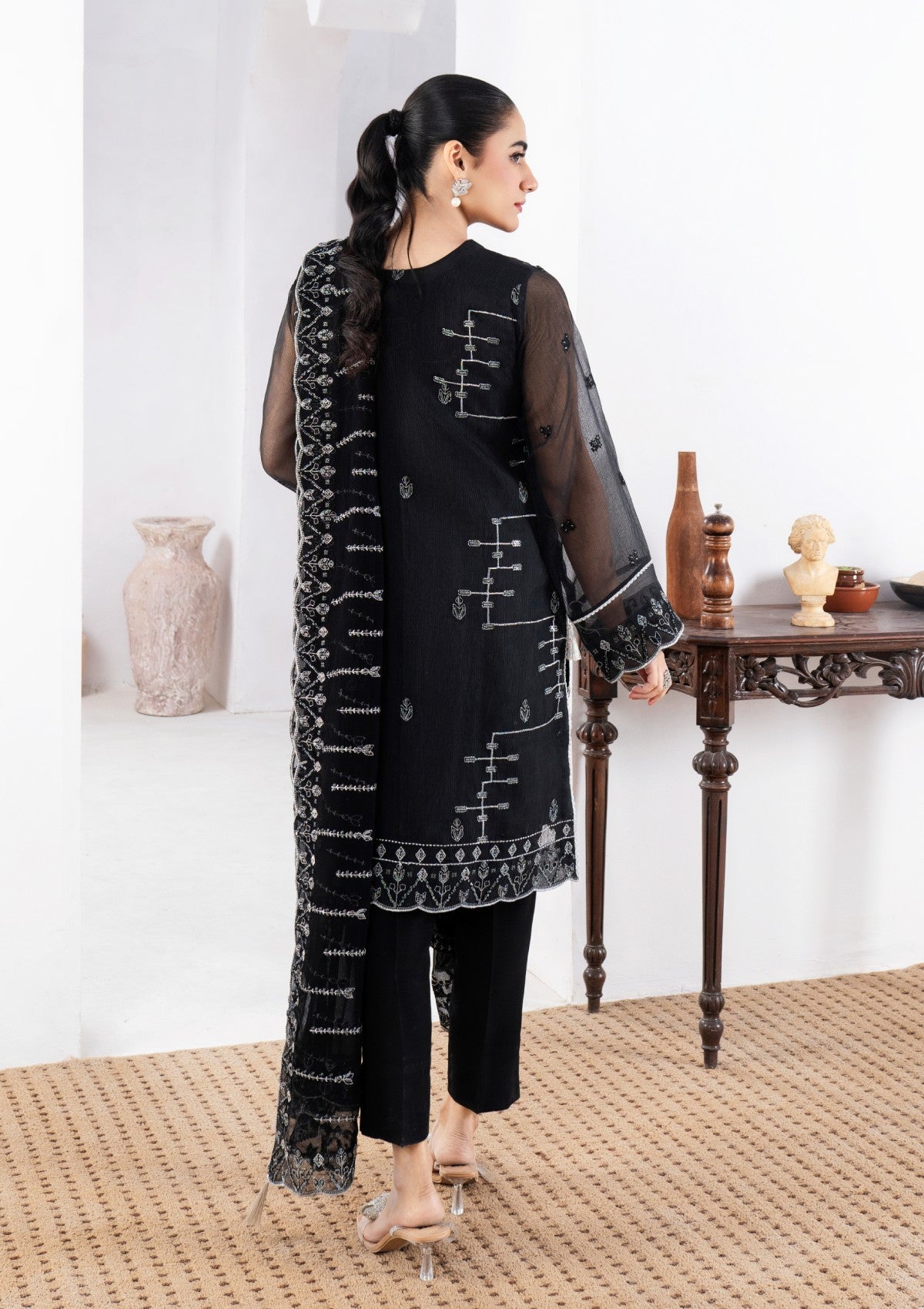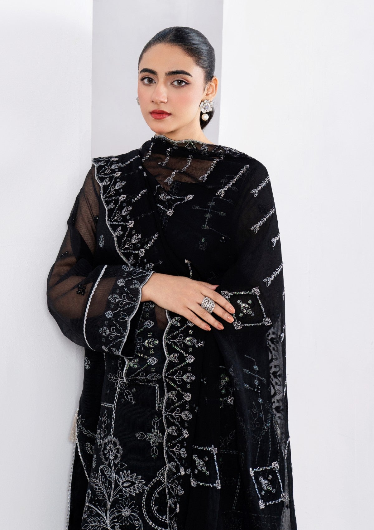 This enchanting 4-piece Black organza set is adorned with delicate silver tilla embroidery. The lightweight and sheer black organza fabric provides a delicate, ethereal quality that complements the shimmering silver tilla work beautifully. The embroidery is intricately detailed with floral motifs and geometric patterns. It has Pk raw silk trouser and inner with chiffon dupatta which has silver tilla embroidery all around borders with detailing. The contrast between the black organza and the radiant silver embroidery creates a striking visual impact, making this ensemble a timeless and versatile choice for festive.
