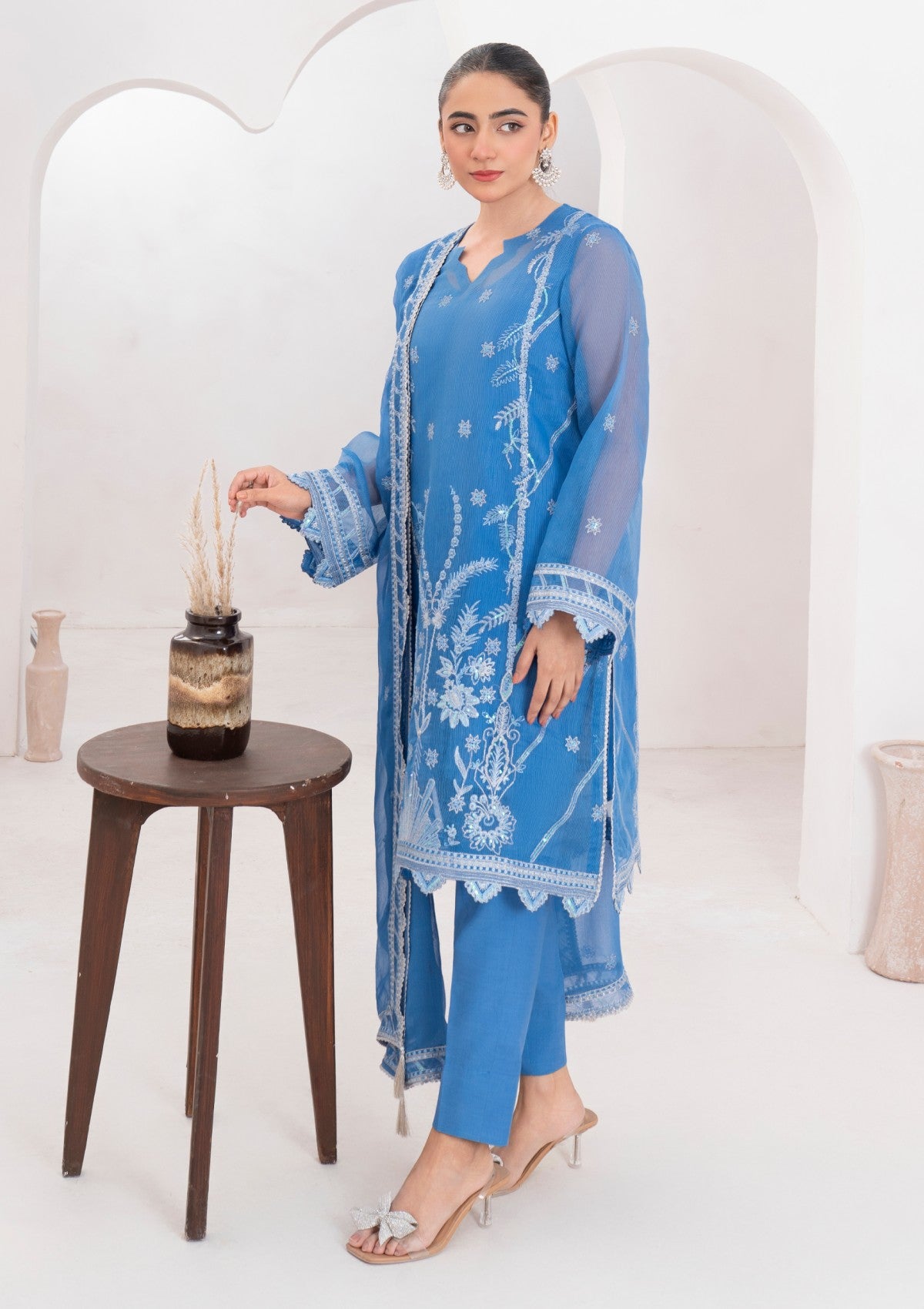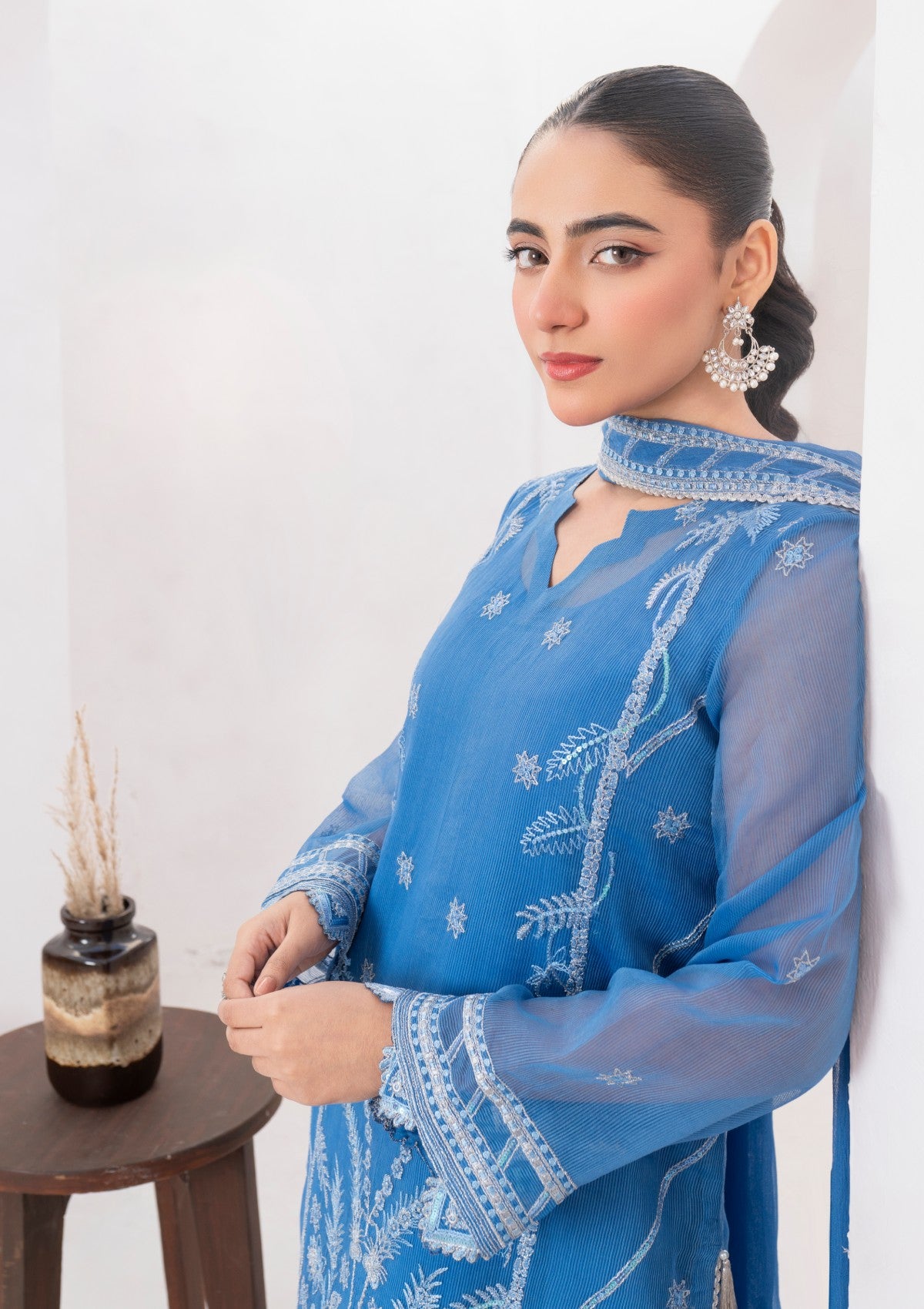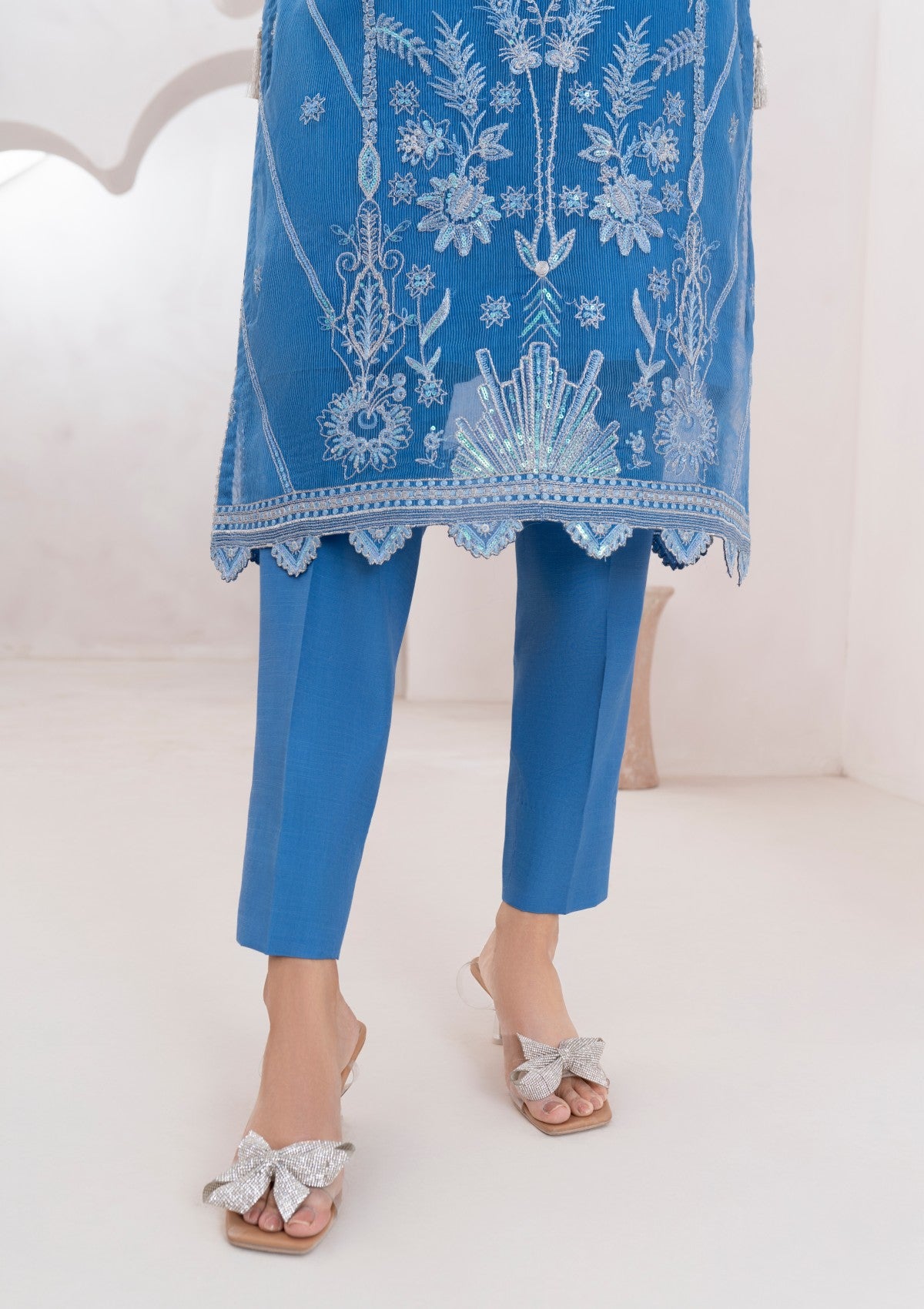 This elegant teal blue organza outfit is adorned with exquisite silver tilla embroidery, creating a stunning blend of depth and shimmer. The rich, vibrant teal blue organza fabric serves as a captivating canvas for the delicate silver tilla work. . It has Pk raw silk trouser and inner with shiffon dupatta which has silver tilla embroidery all around borders with detailing. The embroidery features intricate Botanical and vine patterns. The contrast between the deep teal blue color and the radiant silver embroidery creates a mesmerizing visual effect, making this outfit a timeless addition to any wardrobe.