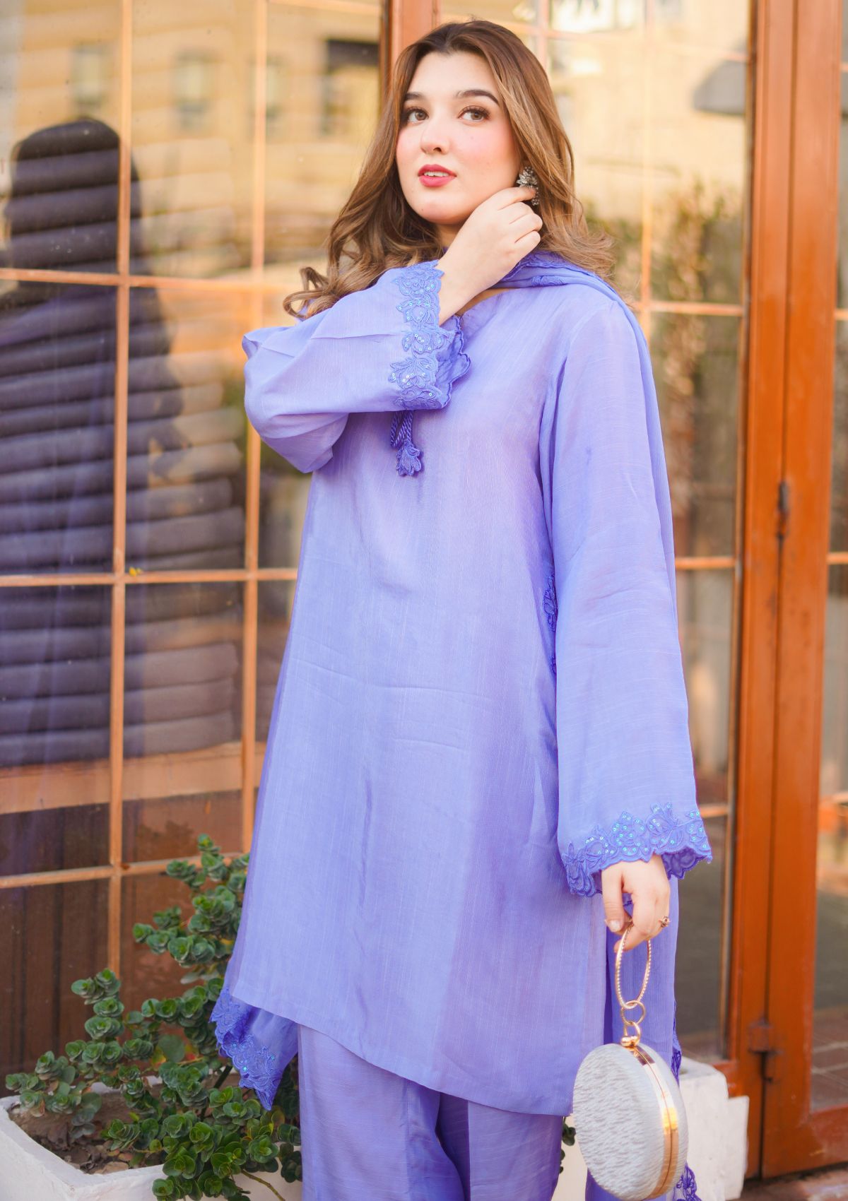 This blue 3-piece PK silk dress features subtle yet elegant minimal embroidery, creating a refined and sophisticated look. The delicately crafted shirt and trouser is complemented by a matching dupatta, offering a timeless, understated charm.This ensemble effortlessly combines modern simplicity with classic elegance.