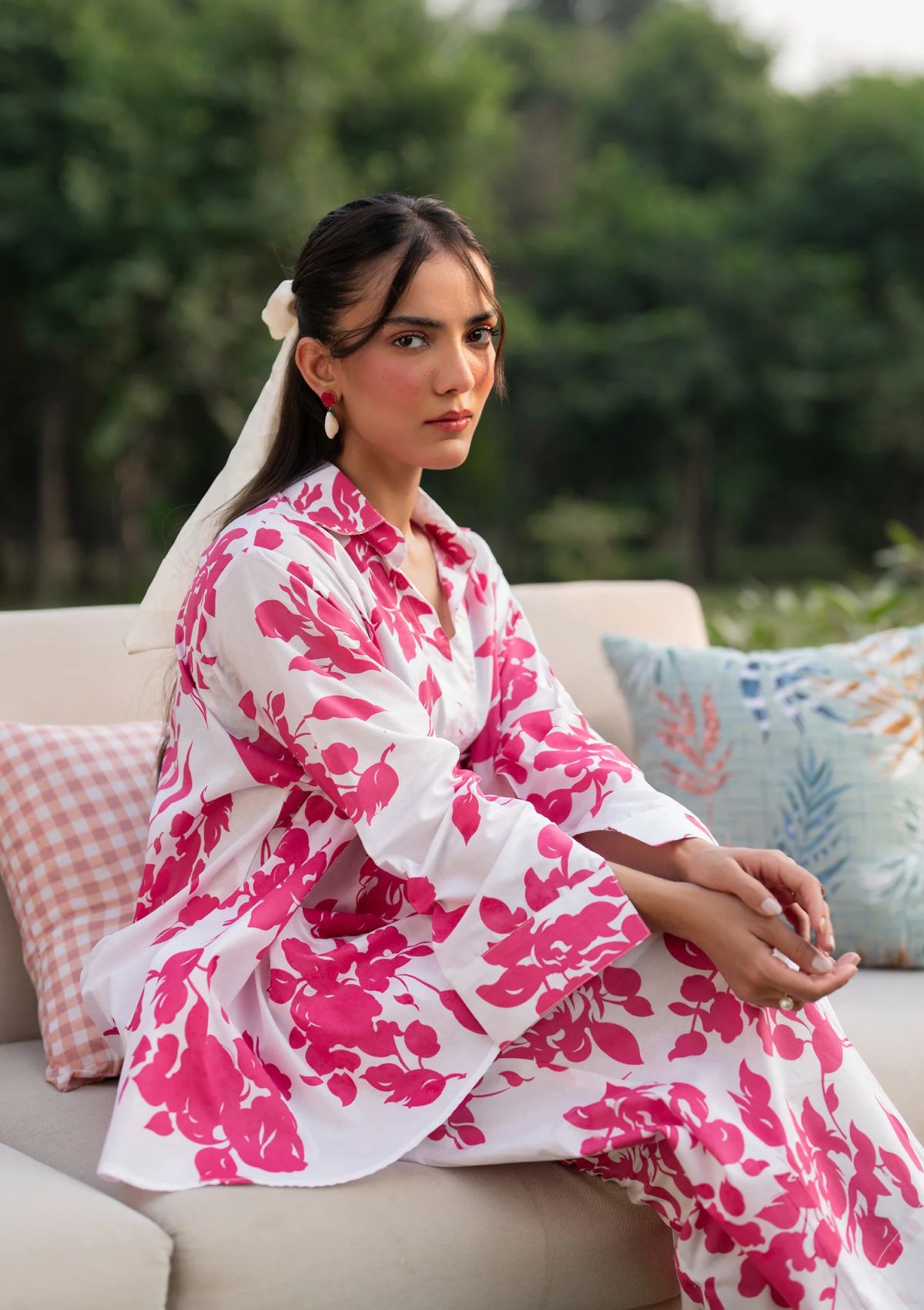 In this sophisticated outfit, a woman wearing a pink kurta with a floral print and matching trousers radiates elegance and style. The lively floral design of the kurta makes it ideal for both informal get-togethers and festive events, and the cozy pants allow for effortless mobility. This ensemble is a must-have for any wardrobe and is perfect for people who value a fusion of traditional and modern styles.