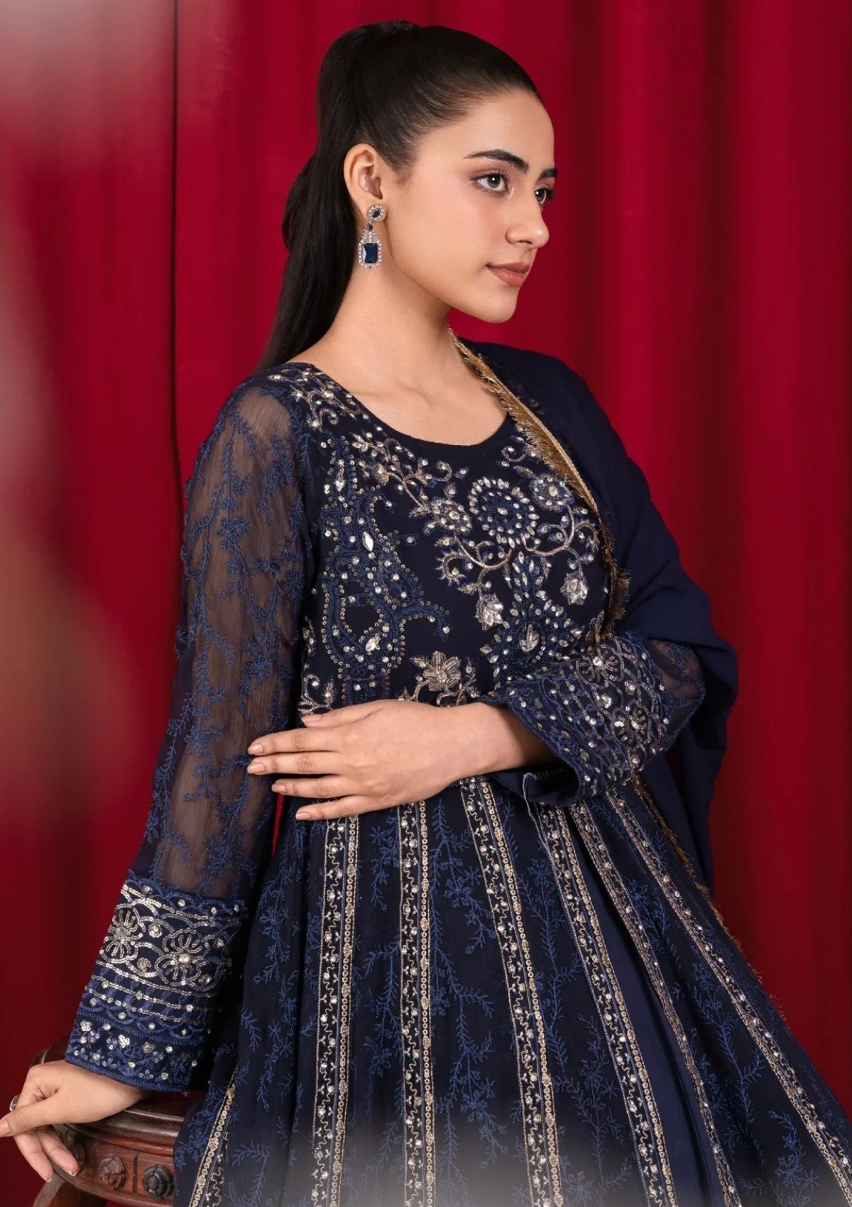 There is exquisite embroidery work in vertical patterns, which exudes grace and elegance, is a marvel of craftsmanship and design. The designer's exquisite use of the zari, Sitara, stone work , and sequin embroidery technique enhances this lovely dress. A gorgeous chiffon dupatta with a kiran lace border completes the ensemble. Make use of Mona Embroidery to showcase your individual style and embrace it.