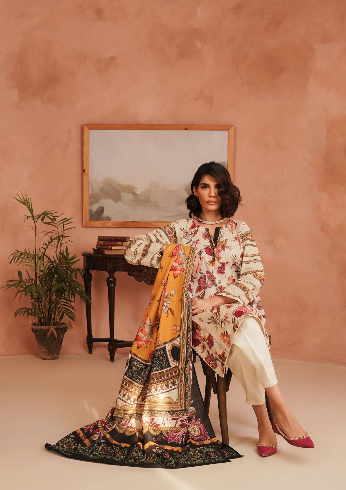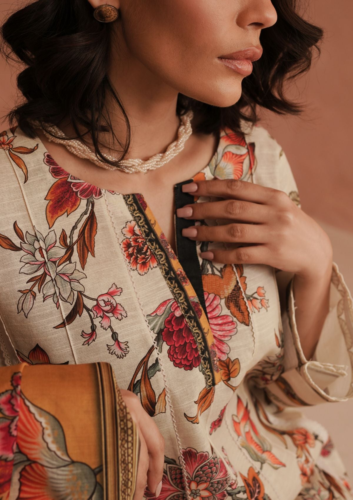 • Roheen is an ivory-toned short kurta embedded with pintucks and a variety of laces over the entire canvas. It is paired with a contrasting printed mustard shawl, making it an elegant addition to your winter closet.