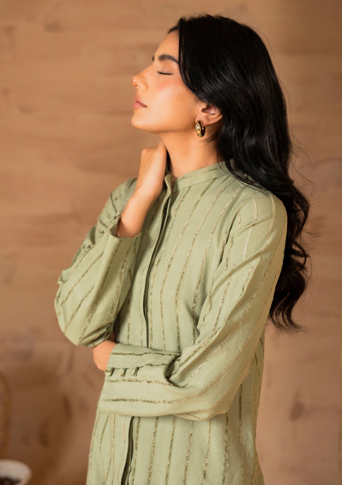 • Oriana, a stunning pistachio green ensemble crafted from luxurious Alpine fabric. The mid-length shirt, adorned with elegant velvet vertical stripes, is perfectly complemented by chic boot-cut trousers.