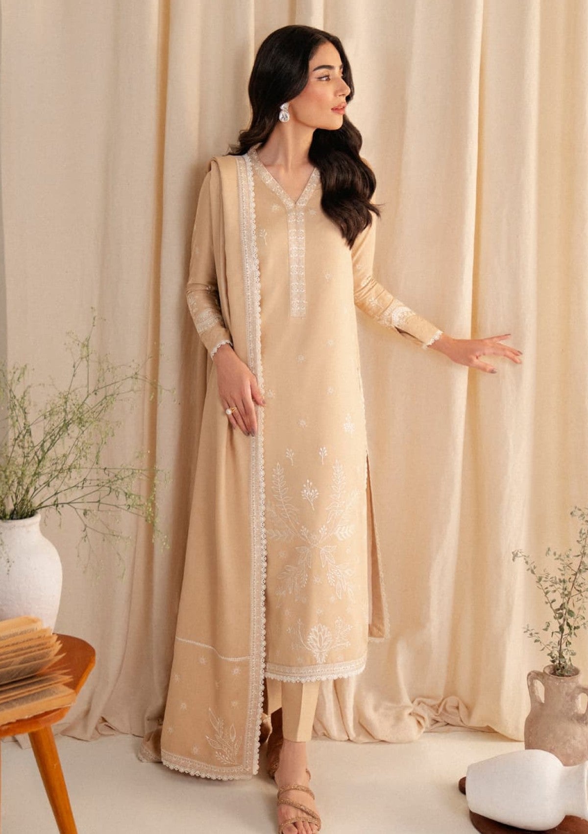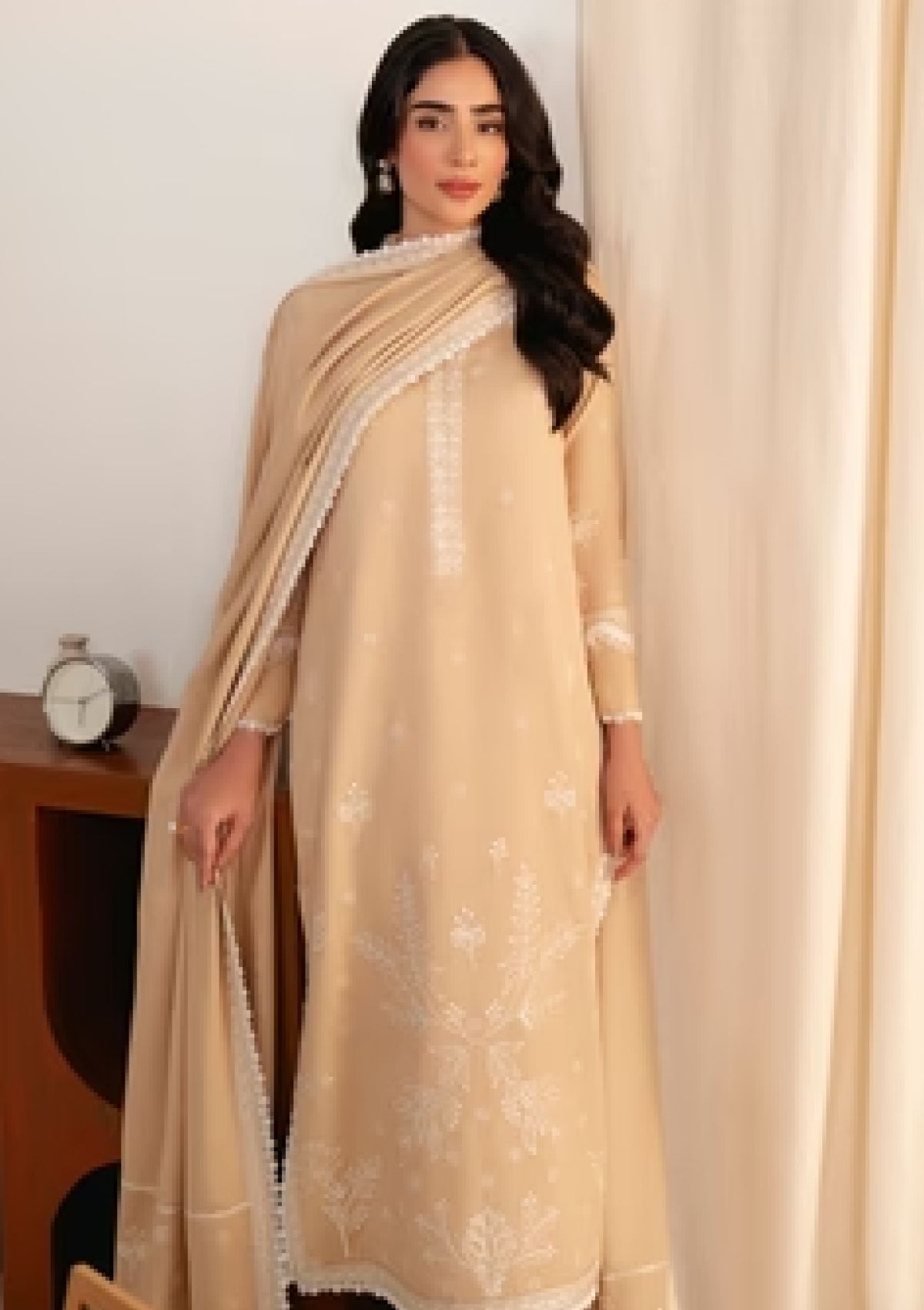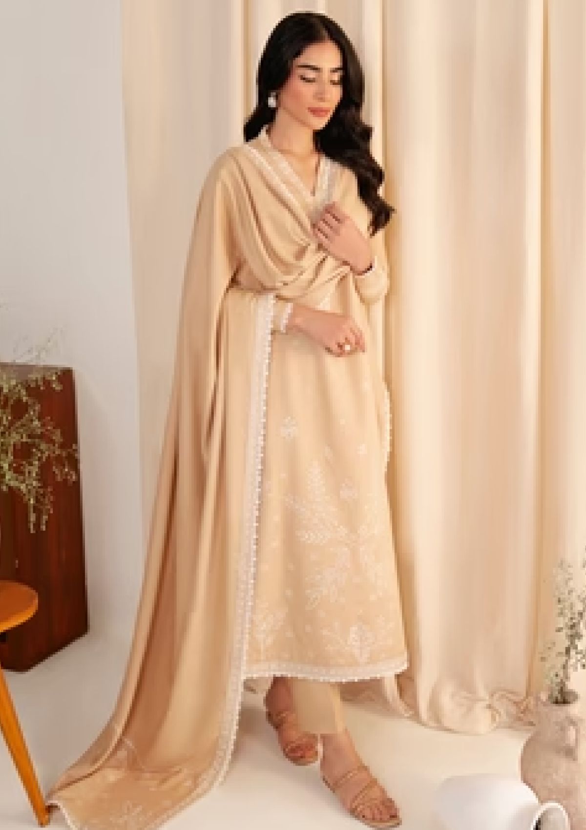 • A symphony of elegance and warmth, designed to capture the essence of winter. This beige masterpiece features intricate white embroidery that exudes timeless charm, paired with a matching karandi shawl adorned with delicately embroidered borders and pallus. Perfect for cozy winter gatherings or serene daytime outings, *Sand Whispers* embodies sophistication and comfort in every thread.